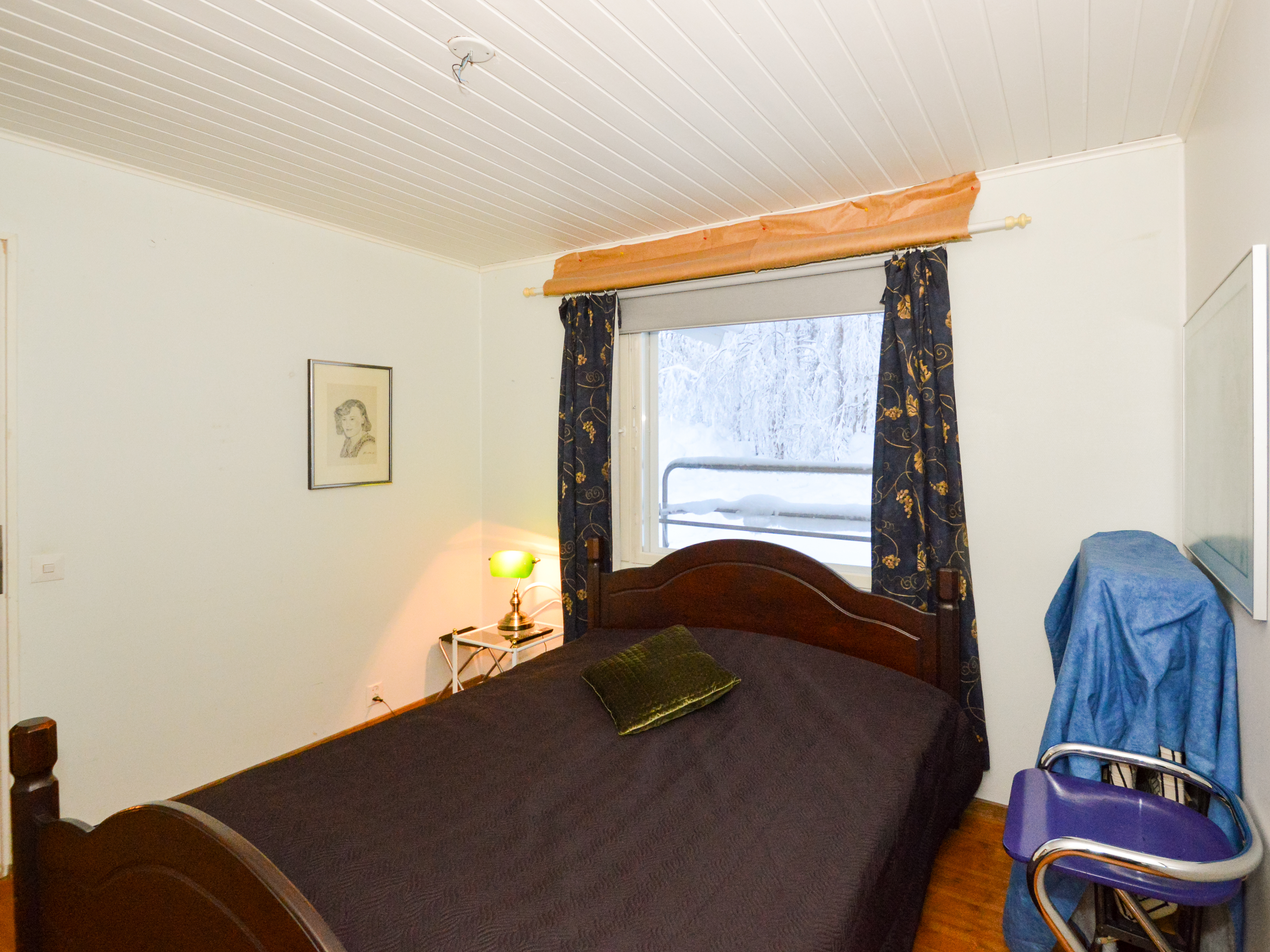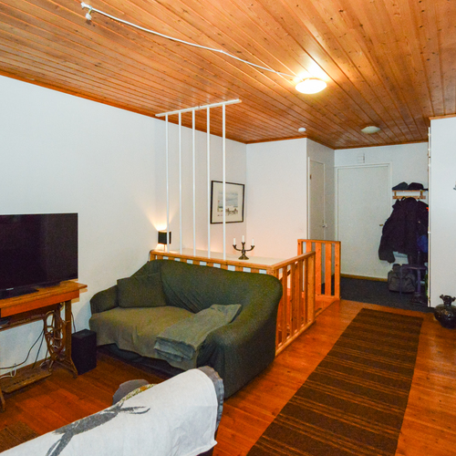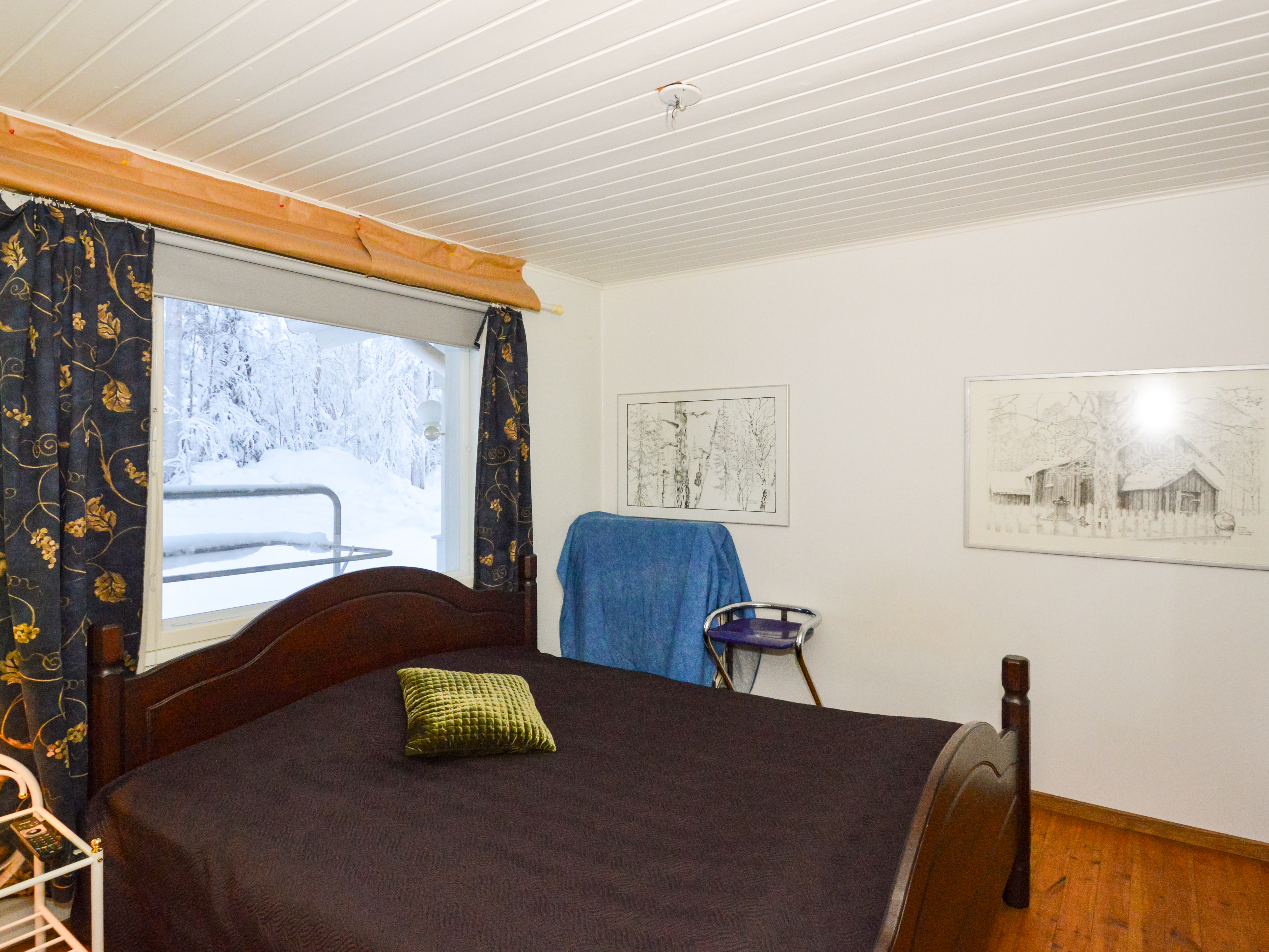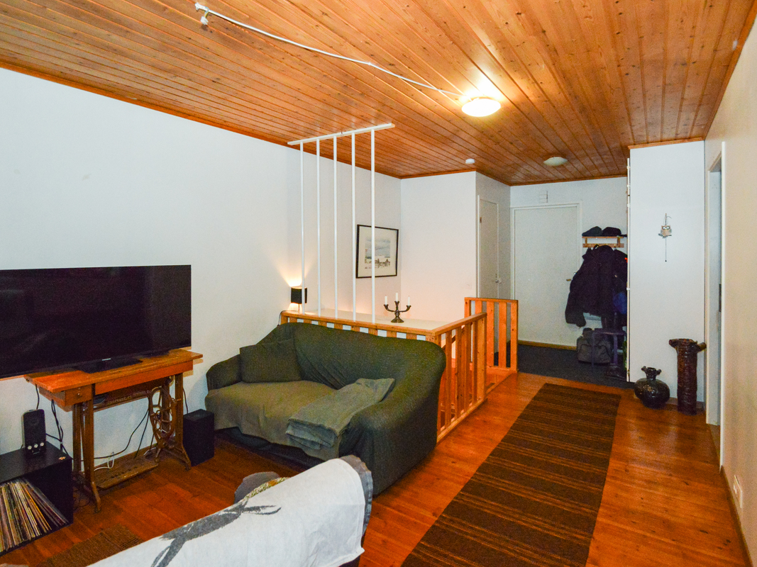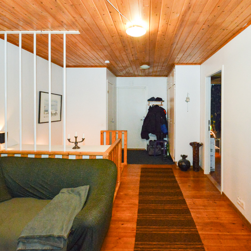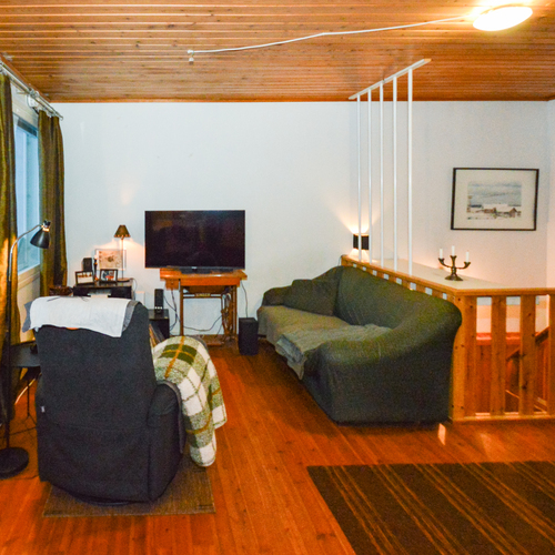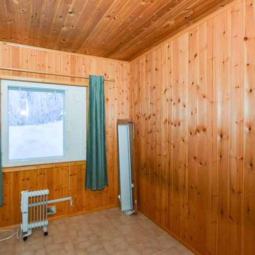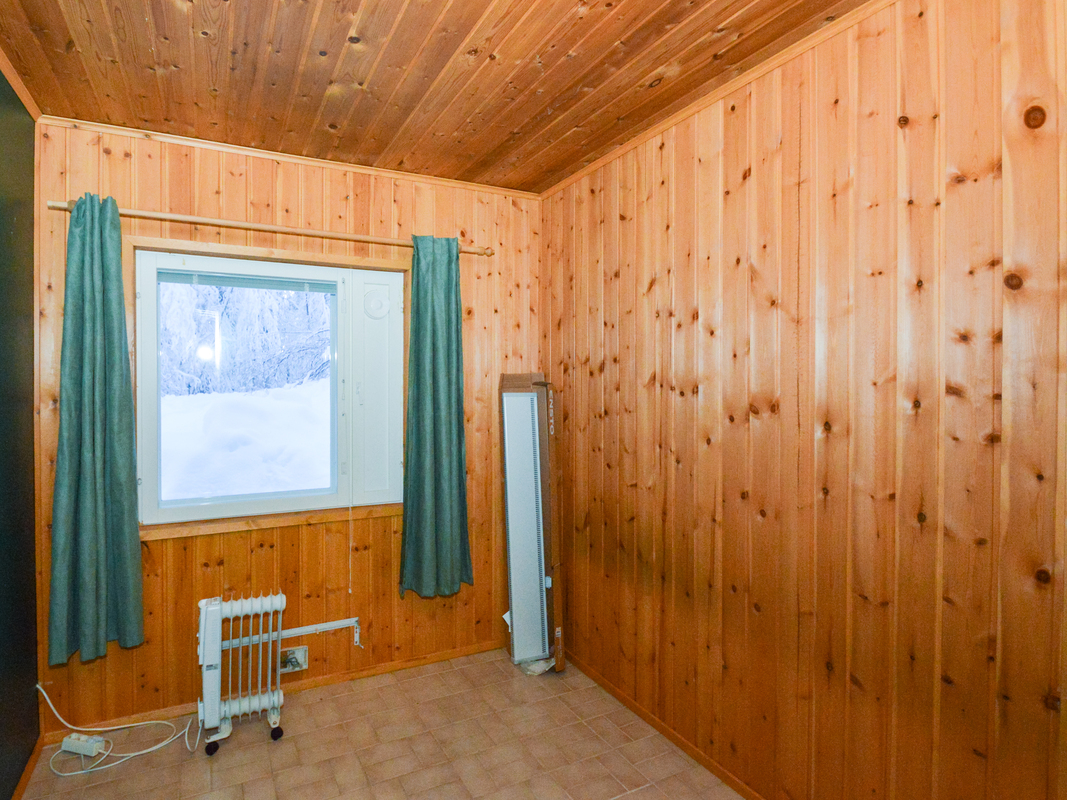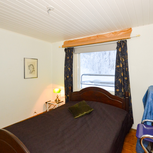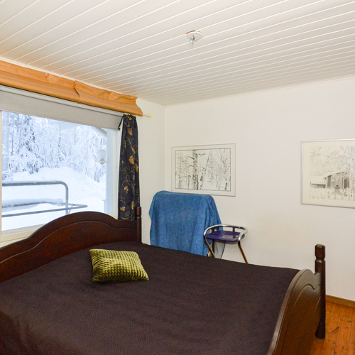 Yläkerrassa yksi makuuhuone ja alakerrassa toinen pienempi makuuhuone takkahuoneen yhteydessä. Alakerran makuuhuoneessa lattialämmitys.