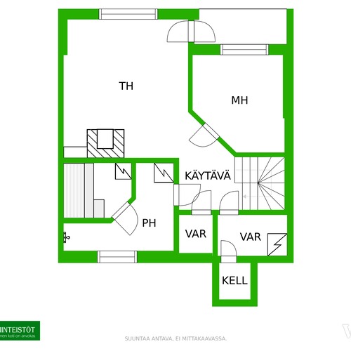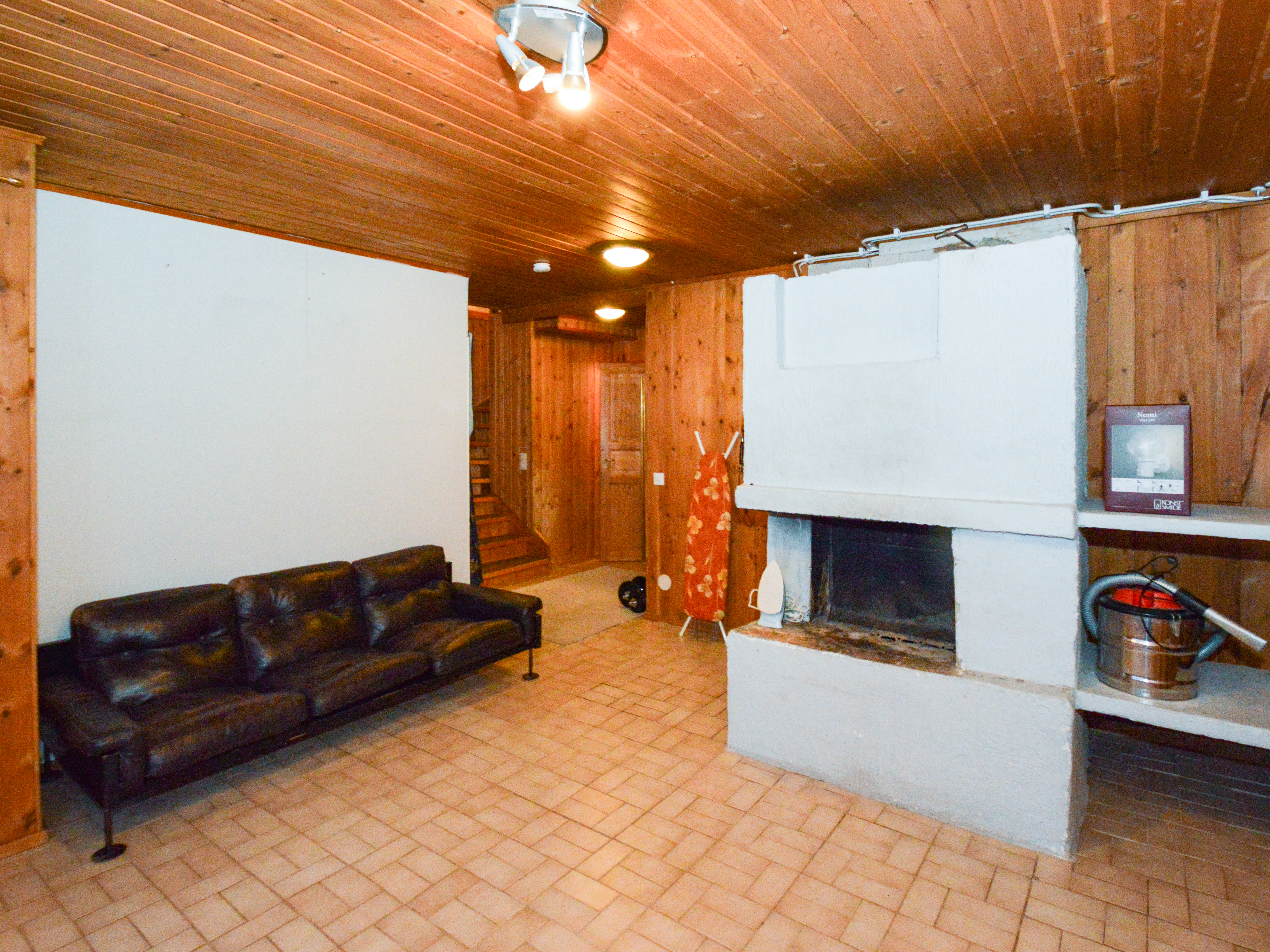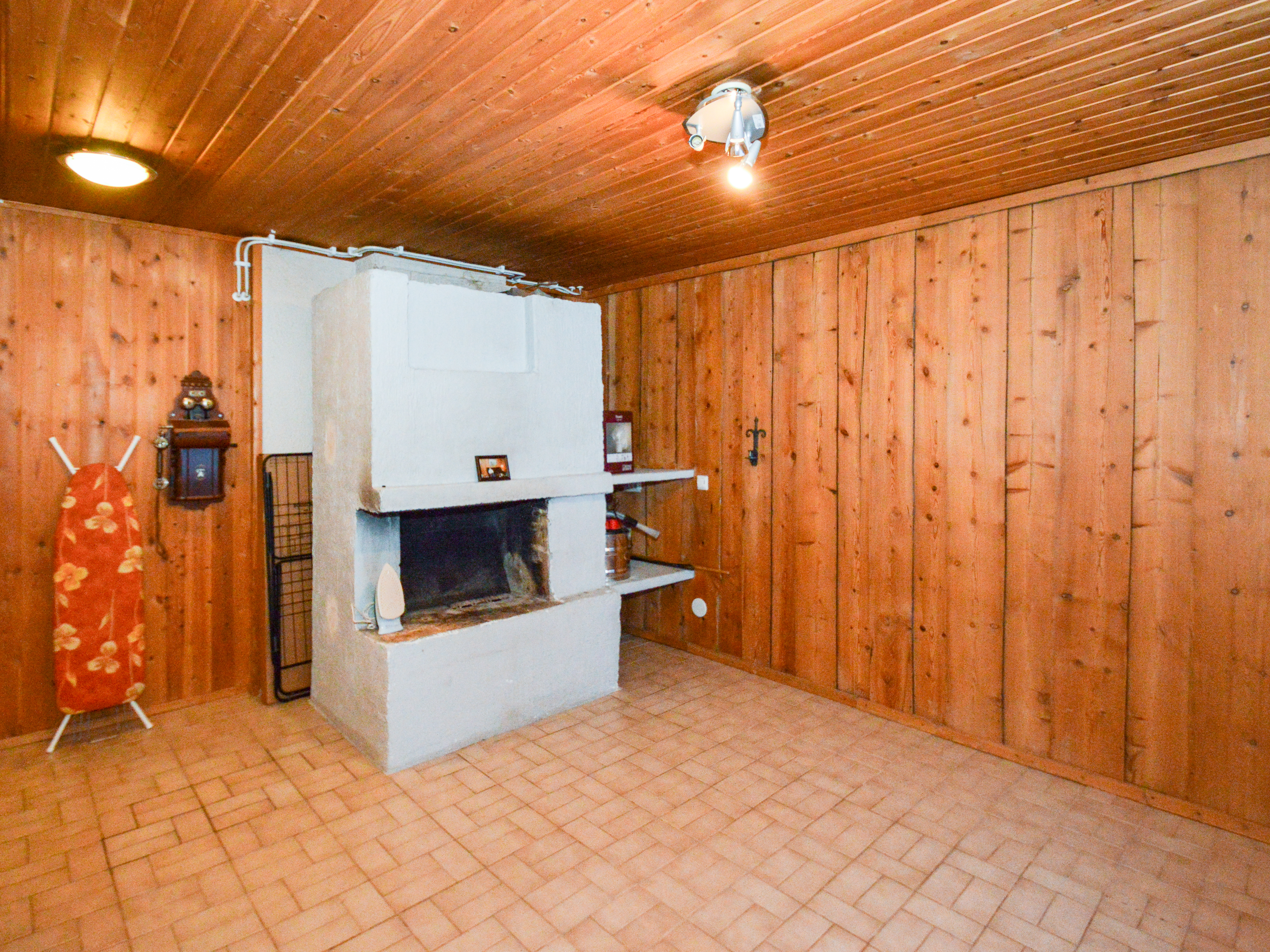 Alakerrassa takkahuone josta käynti takapihalle. Lisäksi kaksi varastohuonetta ja kellarikomero.