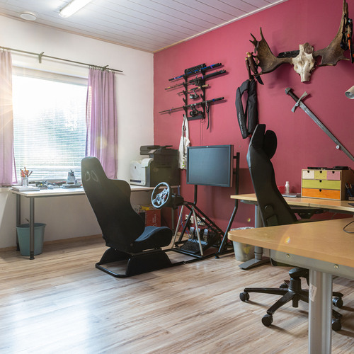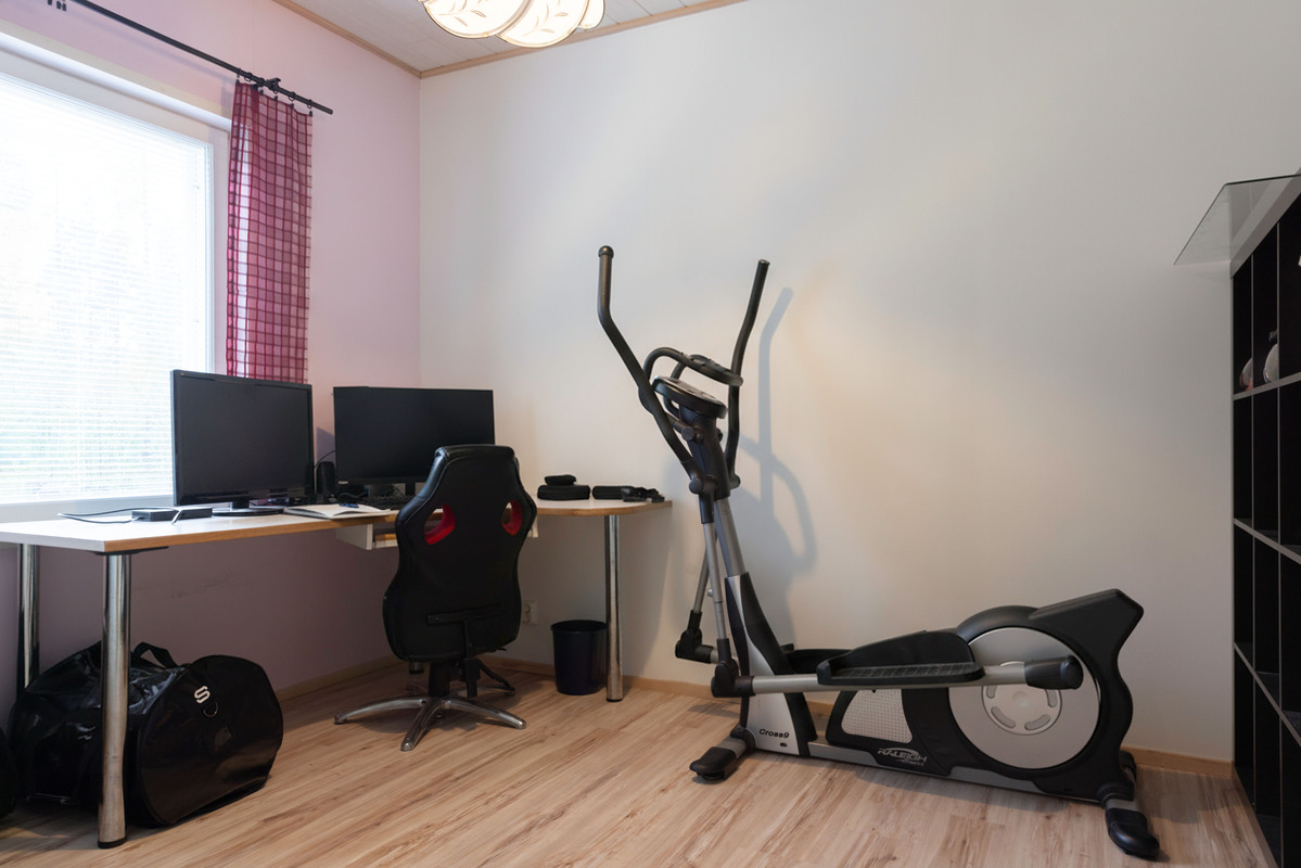 Rakennuksen yhteydessä sijaitseva erillinen monitoimitila omalla sisäänkäynnillä, työhuoneella ja kylpyhuoneella tarjoaa ihanteelliset puitteet yrittäjälle, etätyöntekijälle tai vaikka vierashuoneistoksi.