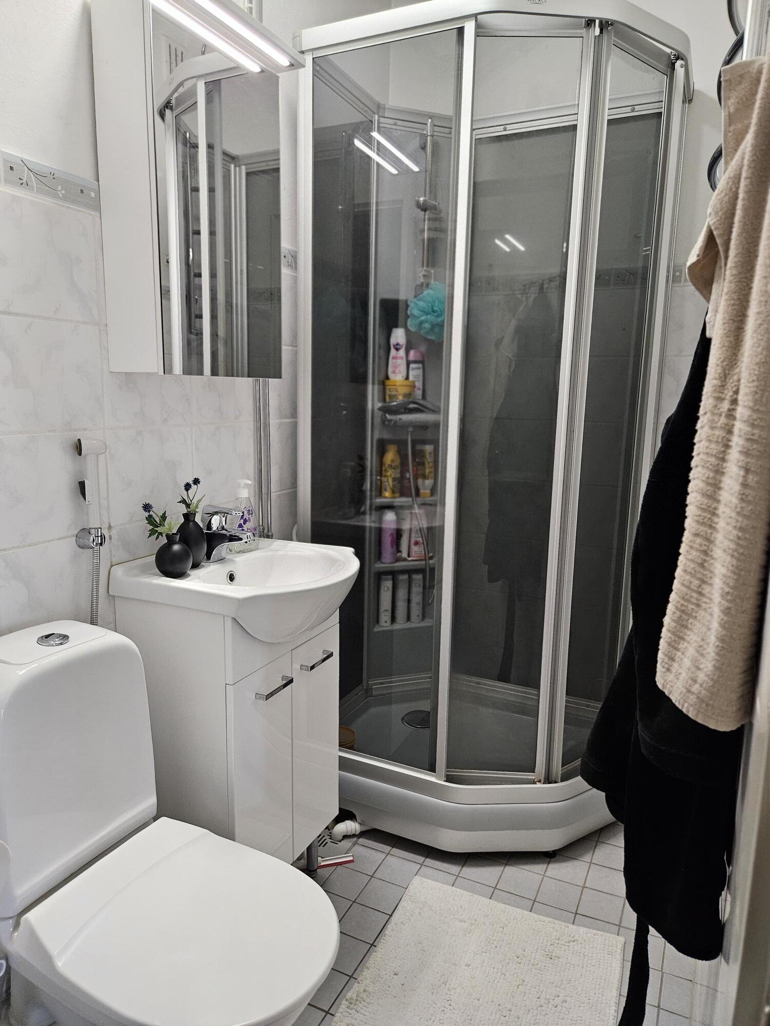 Varusteet: suihkukaappi, wc-istuin, suihku, peilikaappi