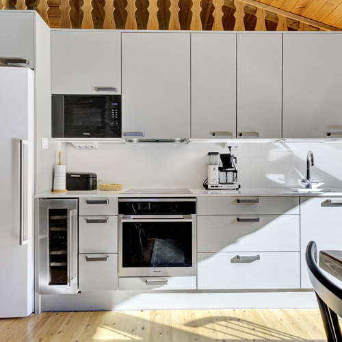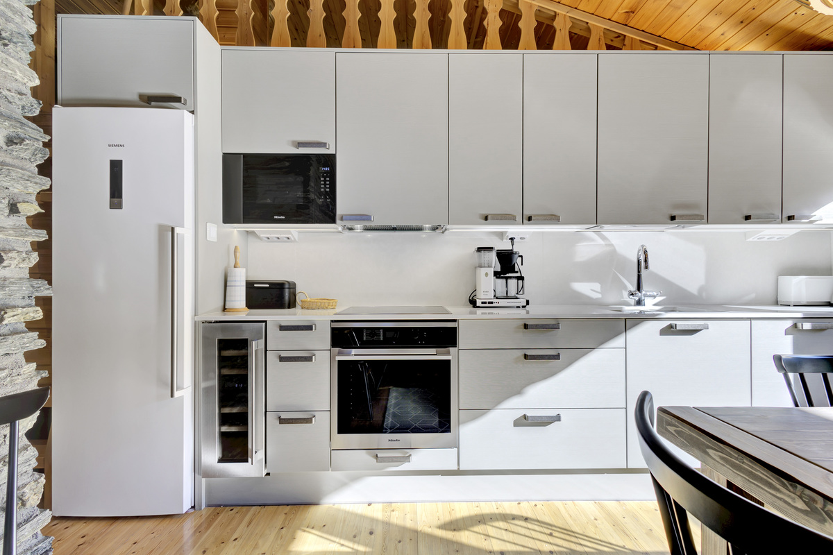 Varusteluun kuuluvat laadukkaat, Mielen integroidut kodinkoneet, Siemensin jääkaappi sekä erillinen viinikaappi.