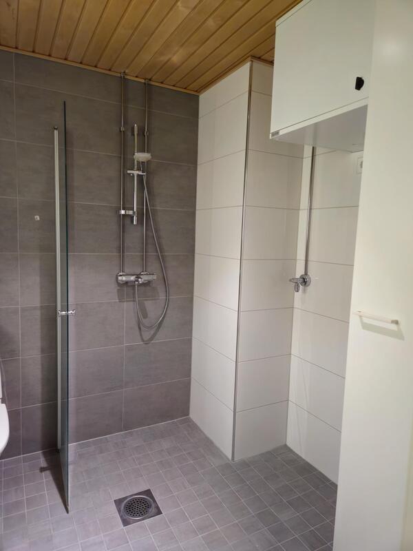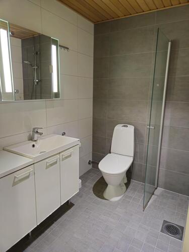 Varusteet: suihkuseinä, pesukoneliitäntä, lattialämmitys, wc-istuin, peilikaappi, kiinteät valaisimet, kylpyhuonekaapisto