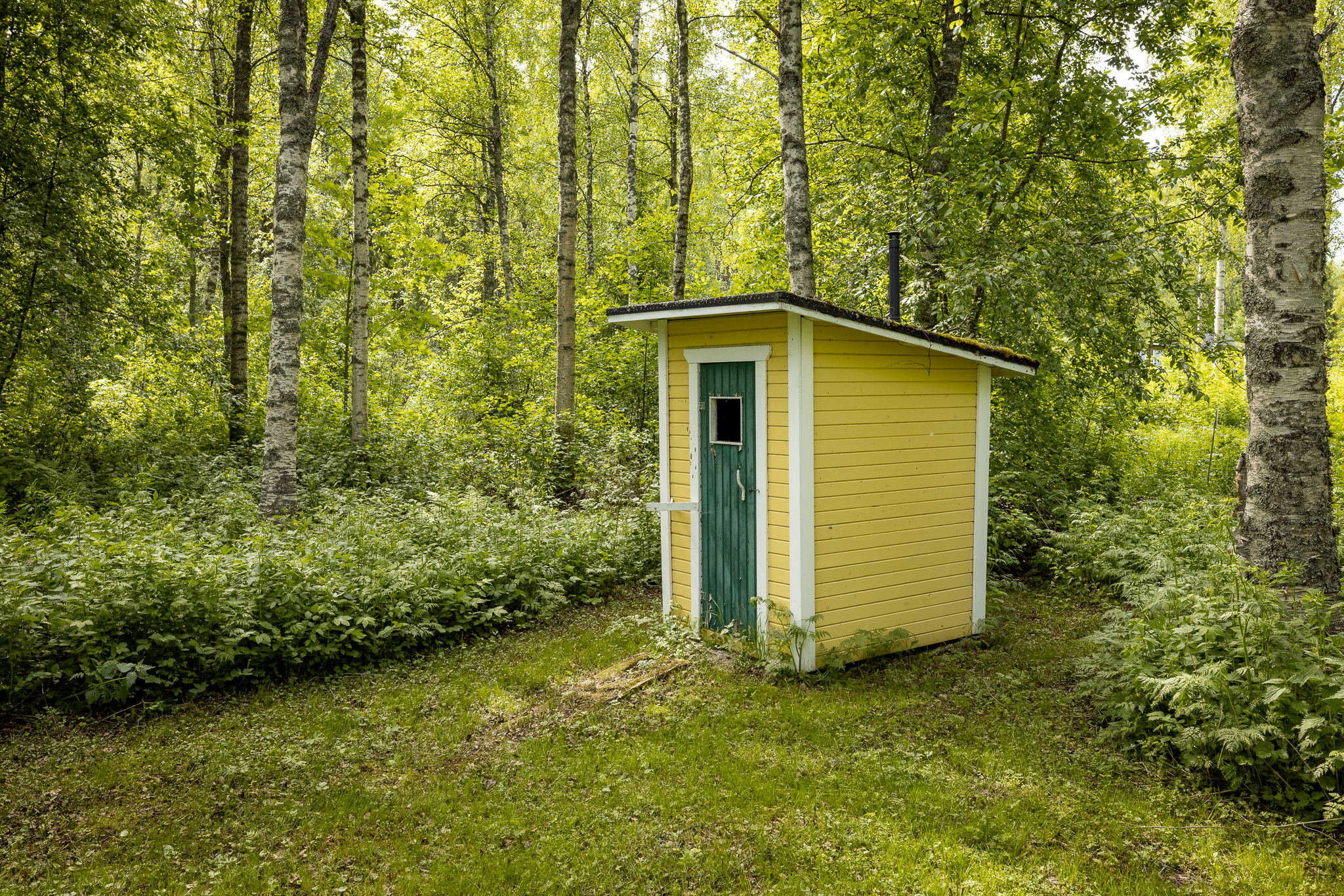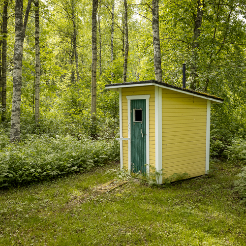 Pihapiirissä lautarakenteinen mökki jonka voi ottaa käyttöön kunnostuksen jälkeen. Ulkokäymälä jossa kuivike wc.