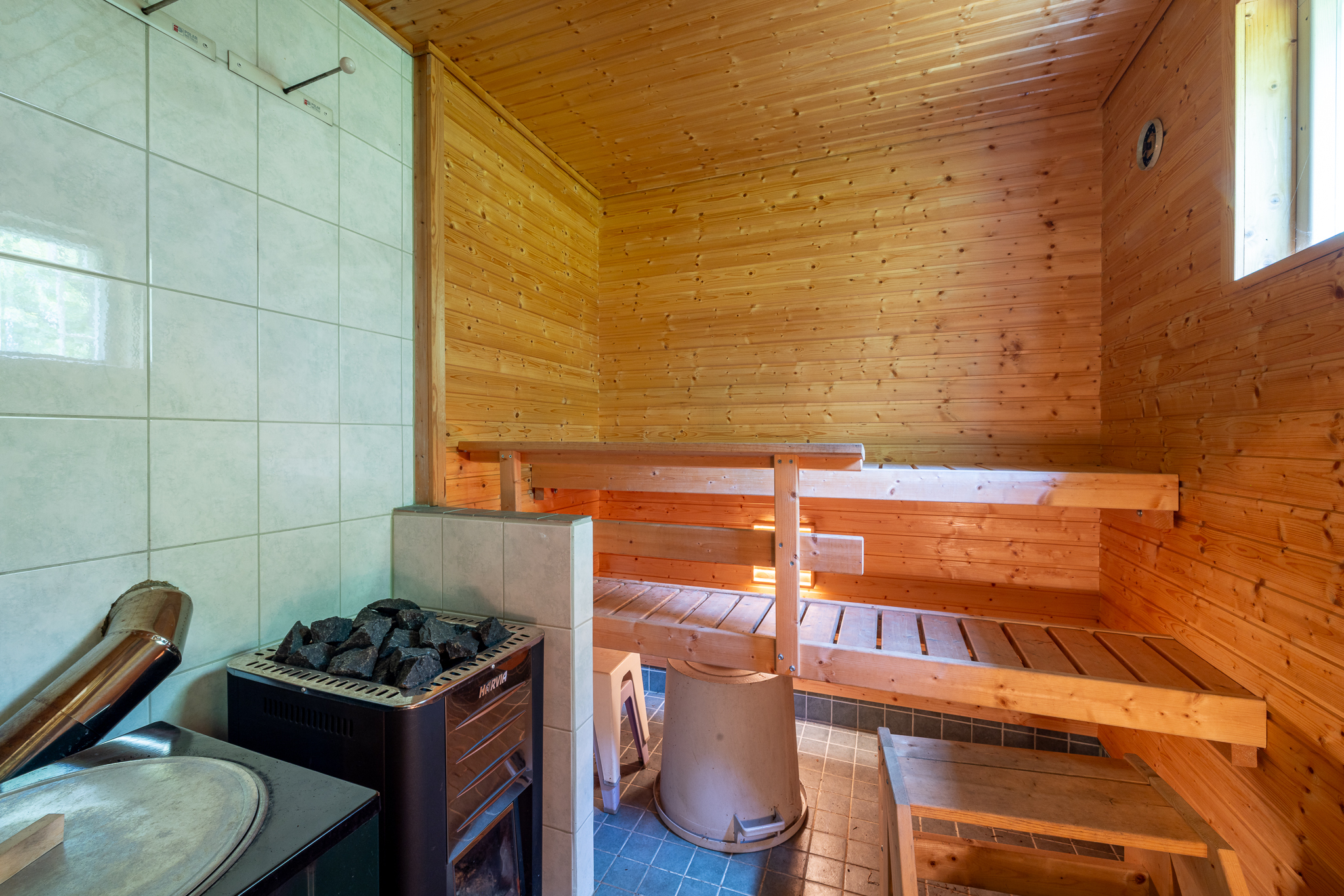 PuukiuasSaunan vesi lämmitetään padassa. Pesutilat saunan yhteydessä. Saunassa lattialämmitys.