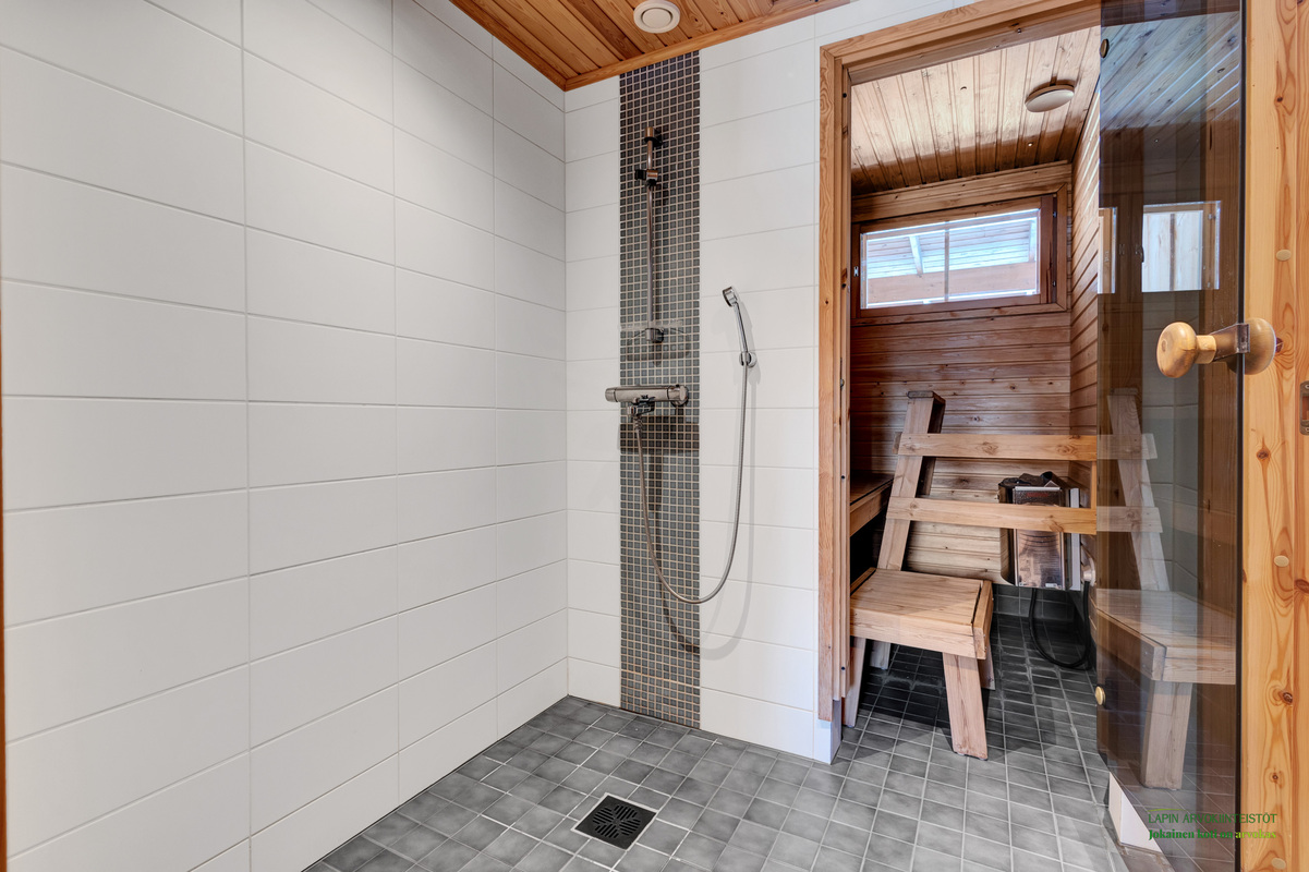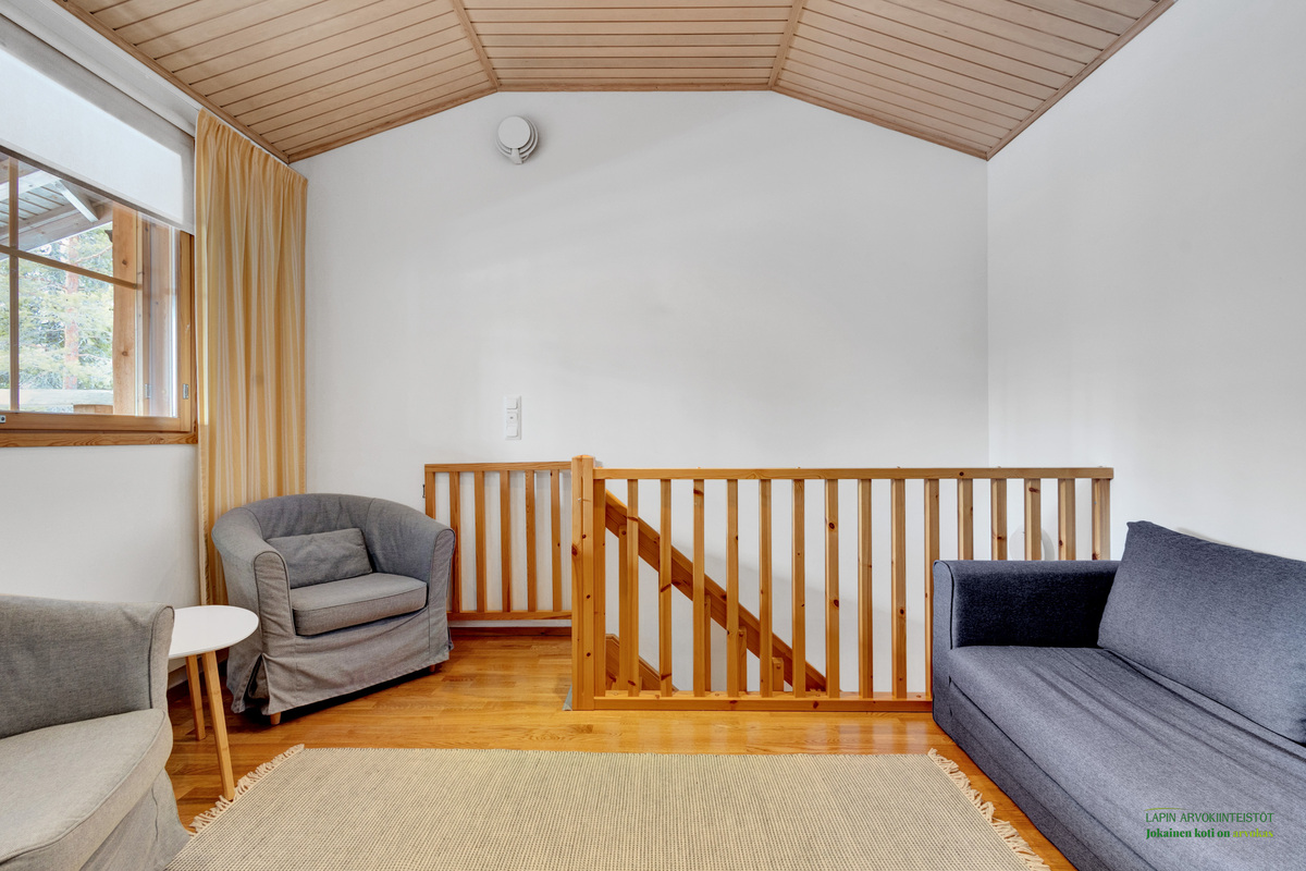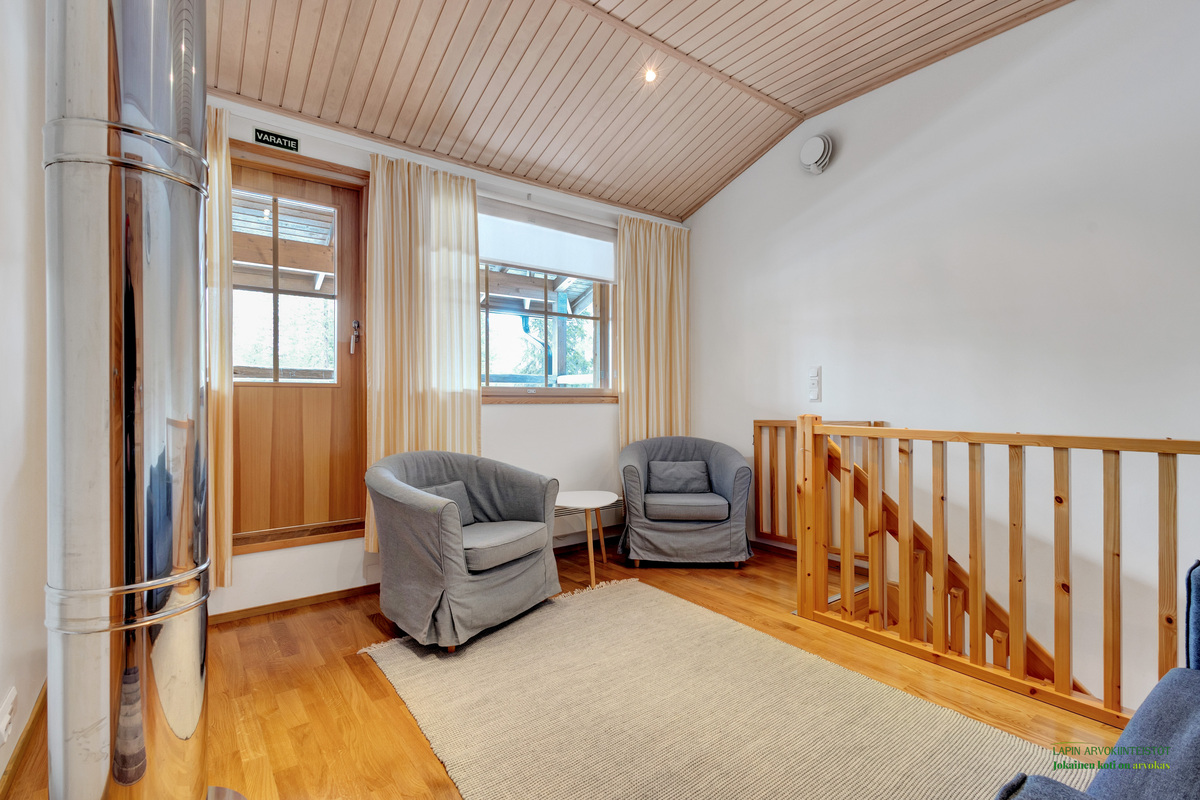 Upstairs, you’ll find a spacious lounge area ideal for resting, spending time together, or accommodating additional guests. This level also features a separate WC, shower room, and a private sauna – the perfect combination after a day of outdoor activities. The generous balcony faces Aarnilampi and offers beautiful views in every season.