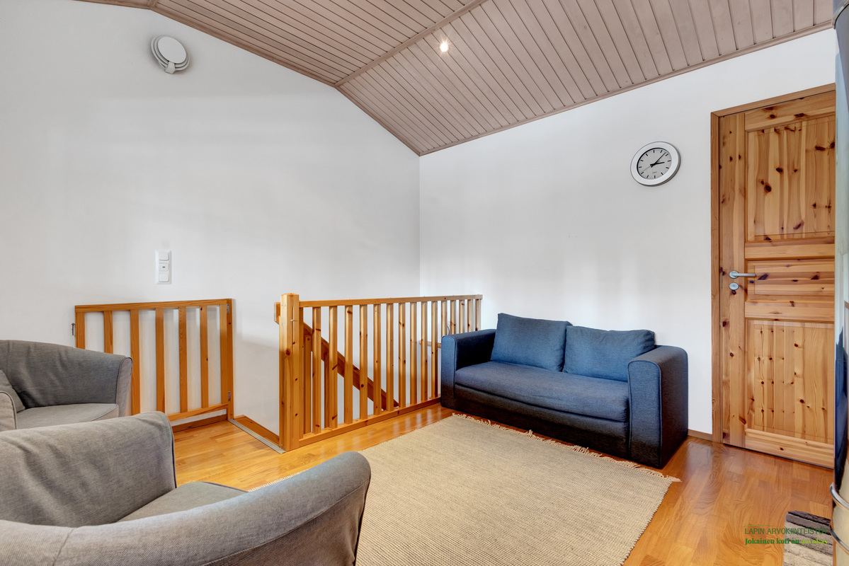 Yläkerrassa odottaa oleskelutila, jossa on tilaa levätä, viettää aikaa tai hyödyntää lisämajoituksena. Kerroksessa on myös erillinen wc, suihkutila sekä oma sauna – täydellinen yhdistelmä ulkoilupäivän jälkeen. Tilava parveke avautuu Aarnilammen suuntaan, ja tarjoaa kauniit näkymät vuodenajasta riippumatta.
