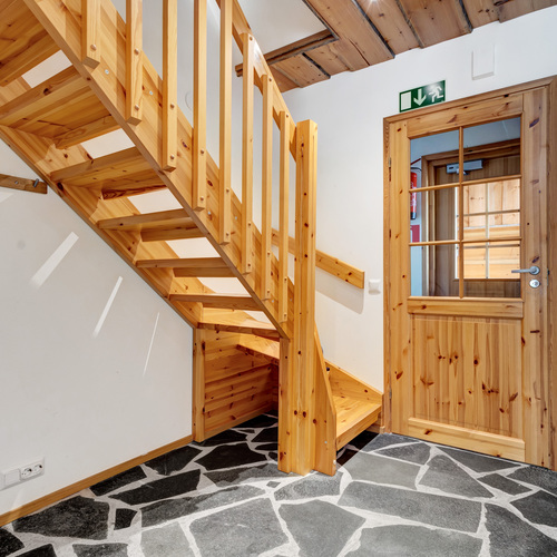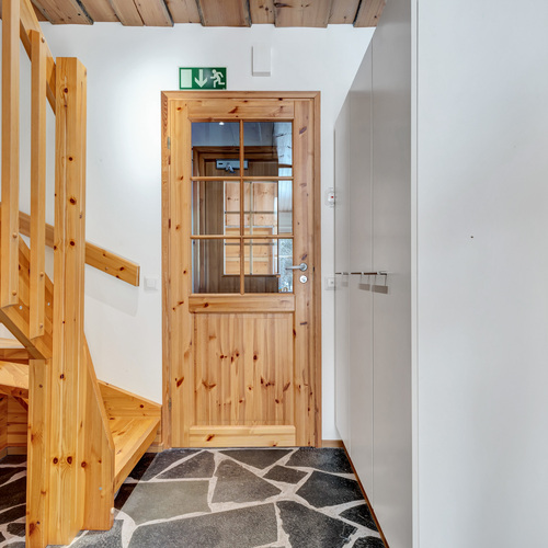 The apartment also includes ample cold storage space, ideal for outdoor equipment, skis, and other recreational gear.