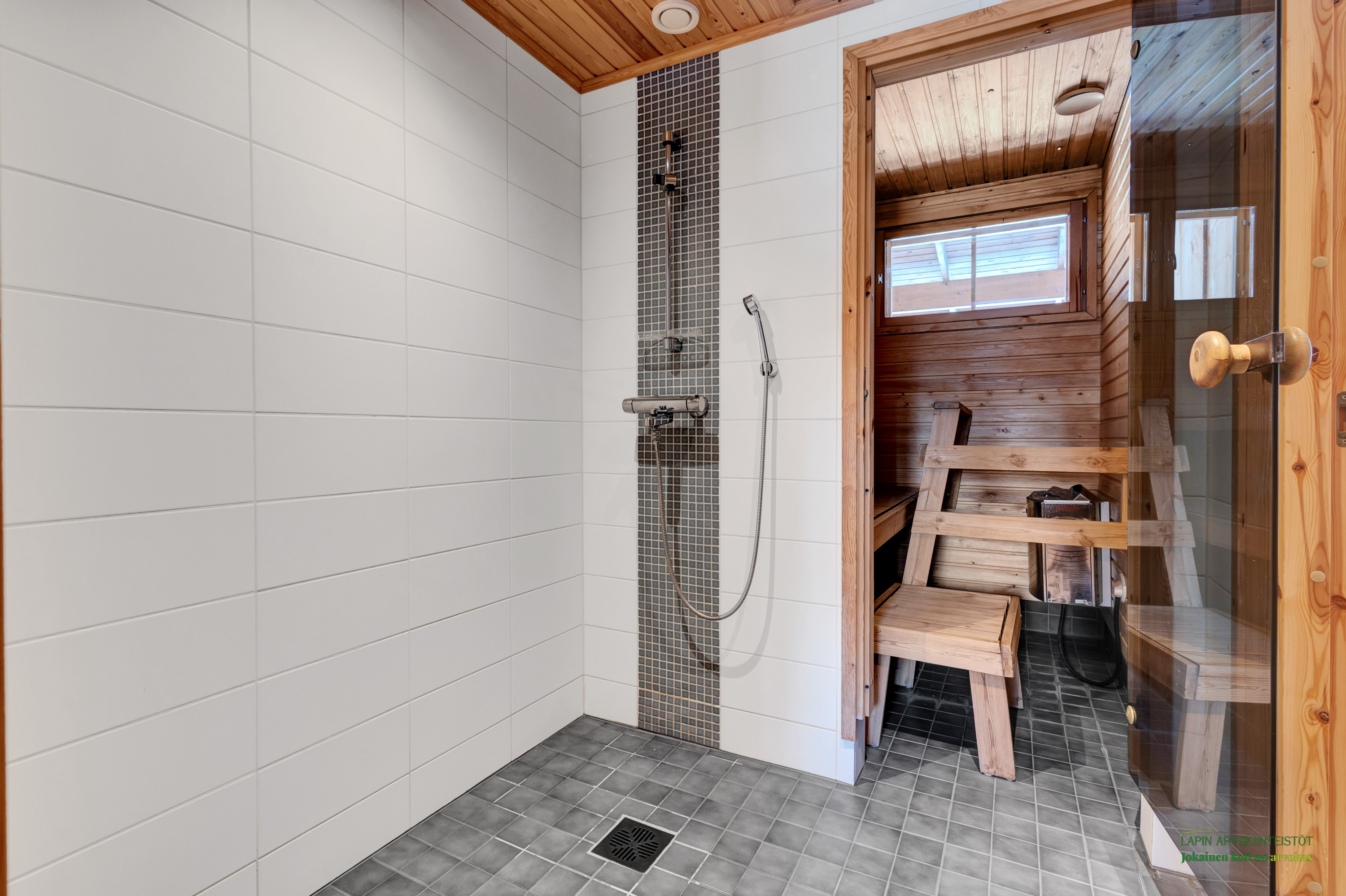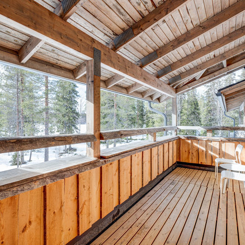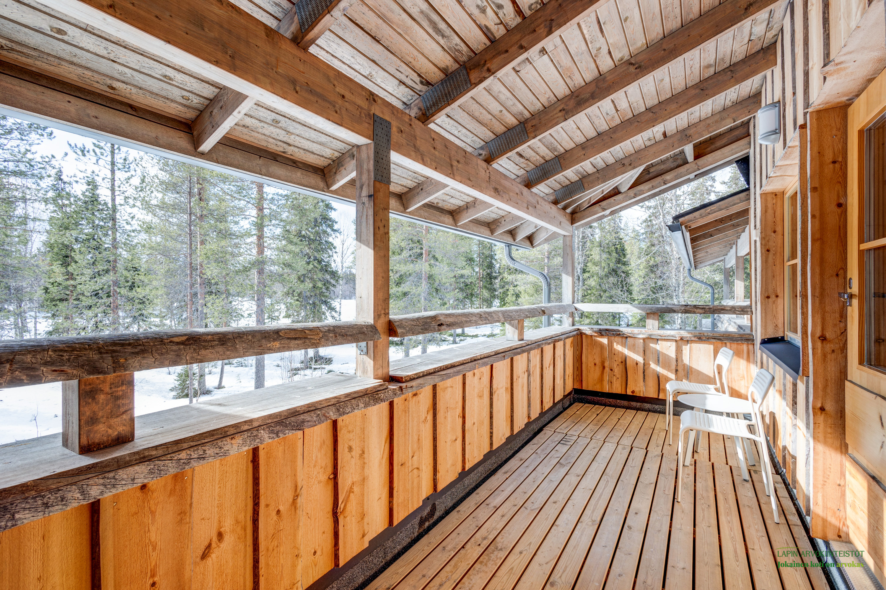 Yläkerrassa odottaa oleskelutila, jossa on tilaa levätä, viettää aikaa tai hyödyntää lisämajoituksena. Kerroksessa on myös erillinen wc, suihkutila sekä oma sauna – täydellinen yhdistelmä ulkoilupäivän jälkeen. Tilava parveke avautuu Aarnilammen suuntaan, ja tarjoaa kauniit näkymät vuodenajasta riippumatta.
