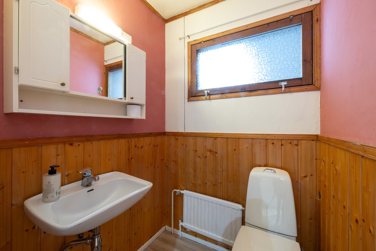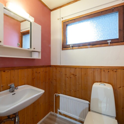Varusteet: lattiaan asennettu WC, peilikaappi
