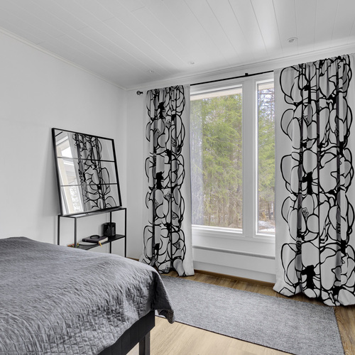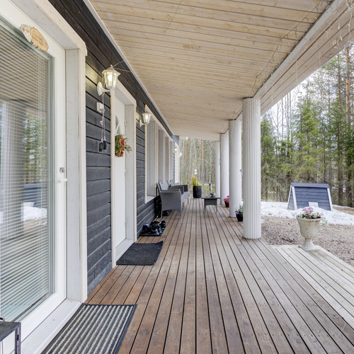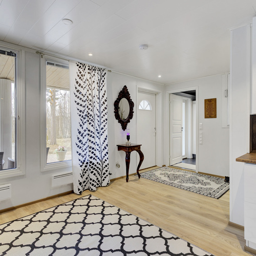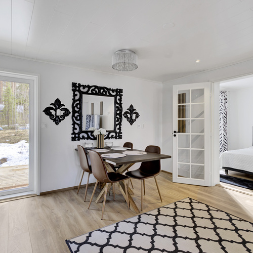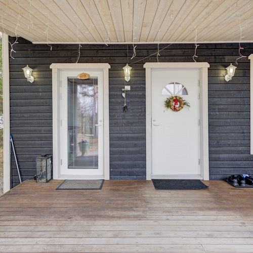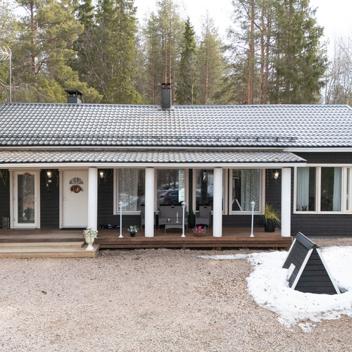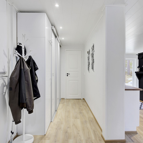 Tilan tuntu on tässä 100,50 (115,3) neliön kodissa käsinkosketeltava. Pohjaratkaisu jakautuu kahteen makuuhuoneeseen, valoisaan tupakeittiöön, kodinhoitohuoneeseen sekä saunalliseen kylpyhuoneeseen. Lisäksi eteisaulan yhteydessä sijaitseva vaatehuone tuo kaivattua säilytystilaa arkeen.