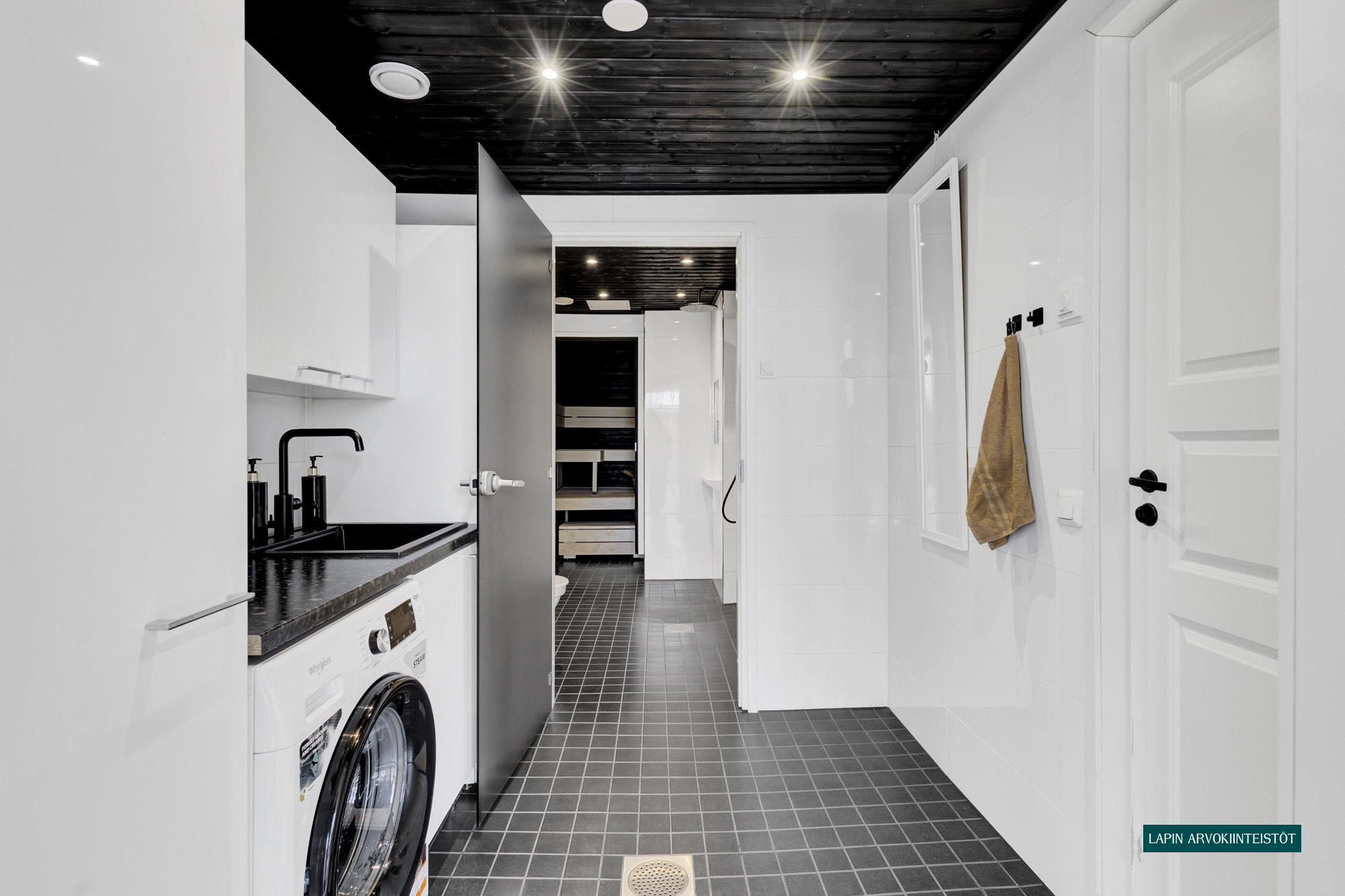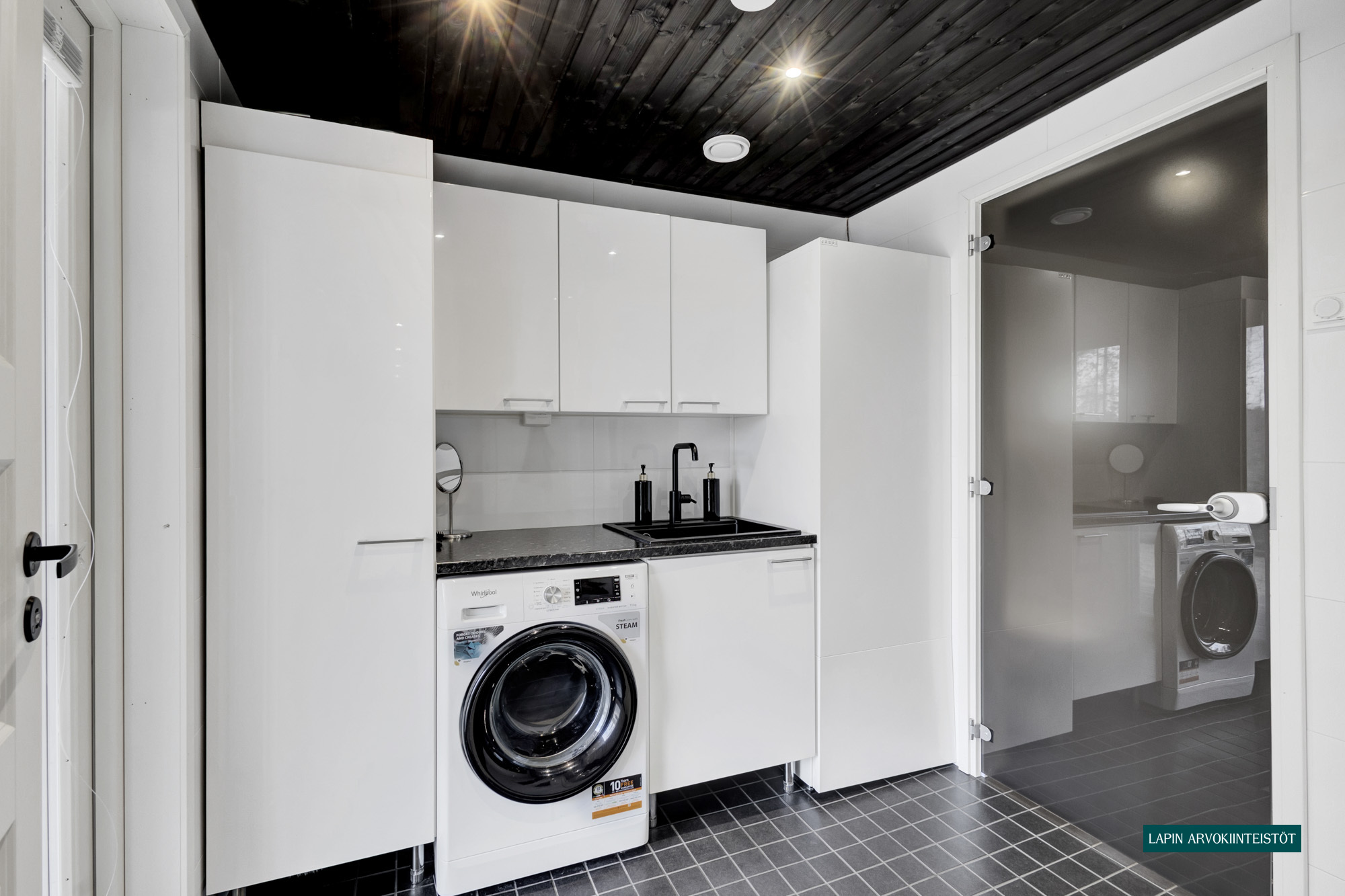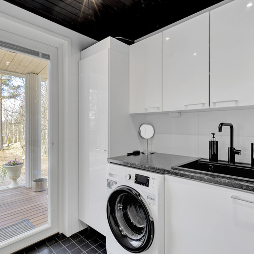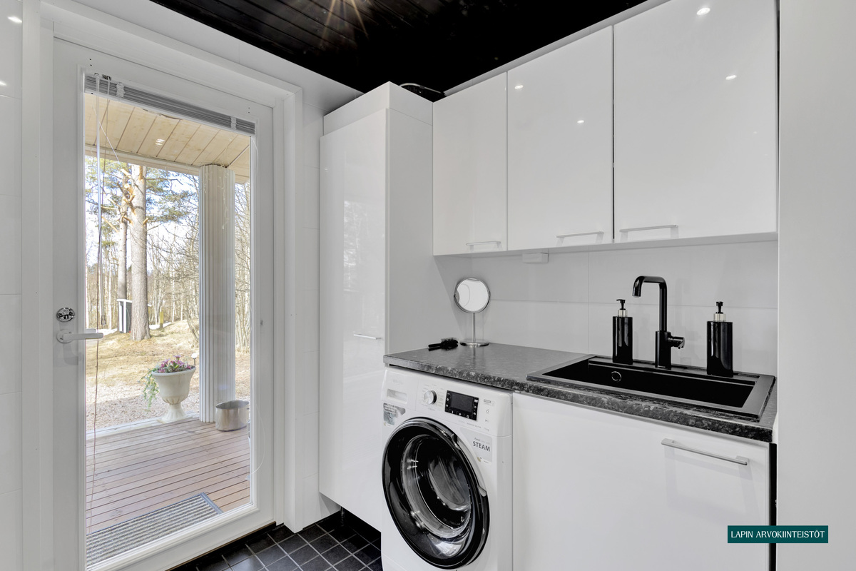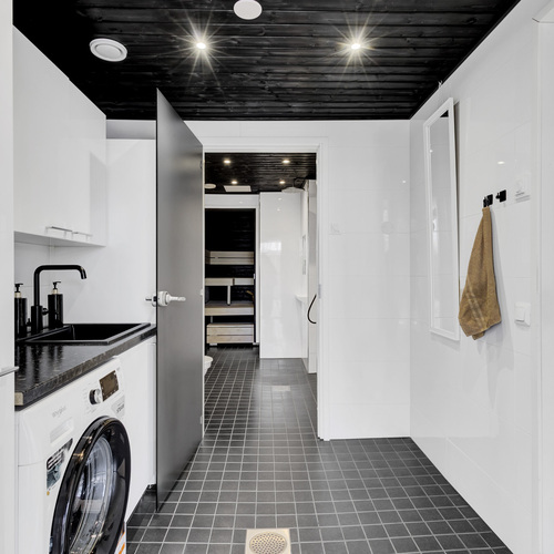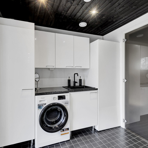 Varusteet: uloskäynti, lattiakaivo, pyykkikaapit, pesuallas, pöytätaso, lattialämmitys, pesukone, pesukoneliitäntä