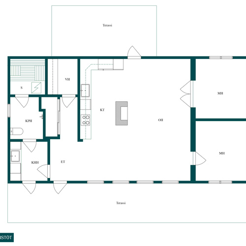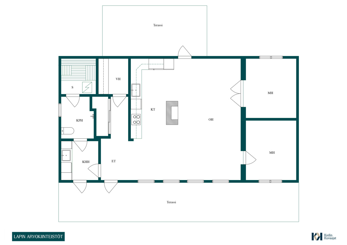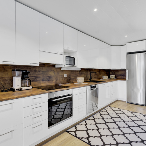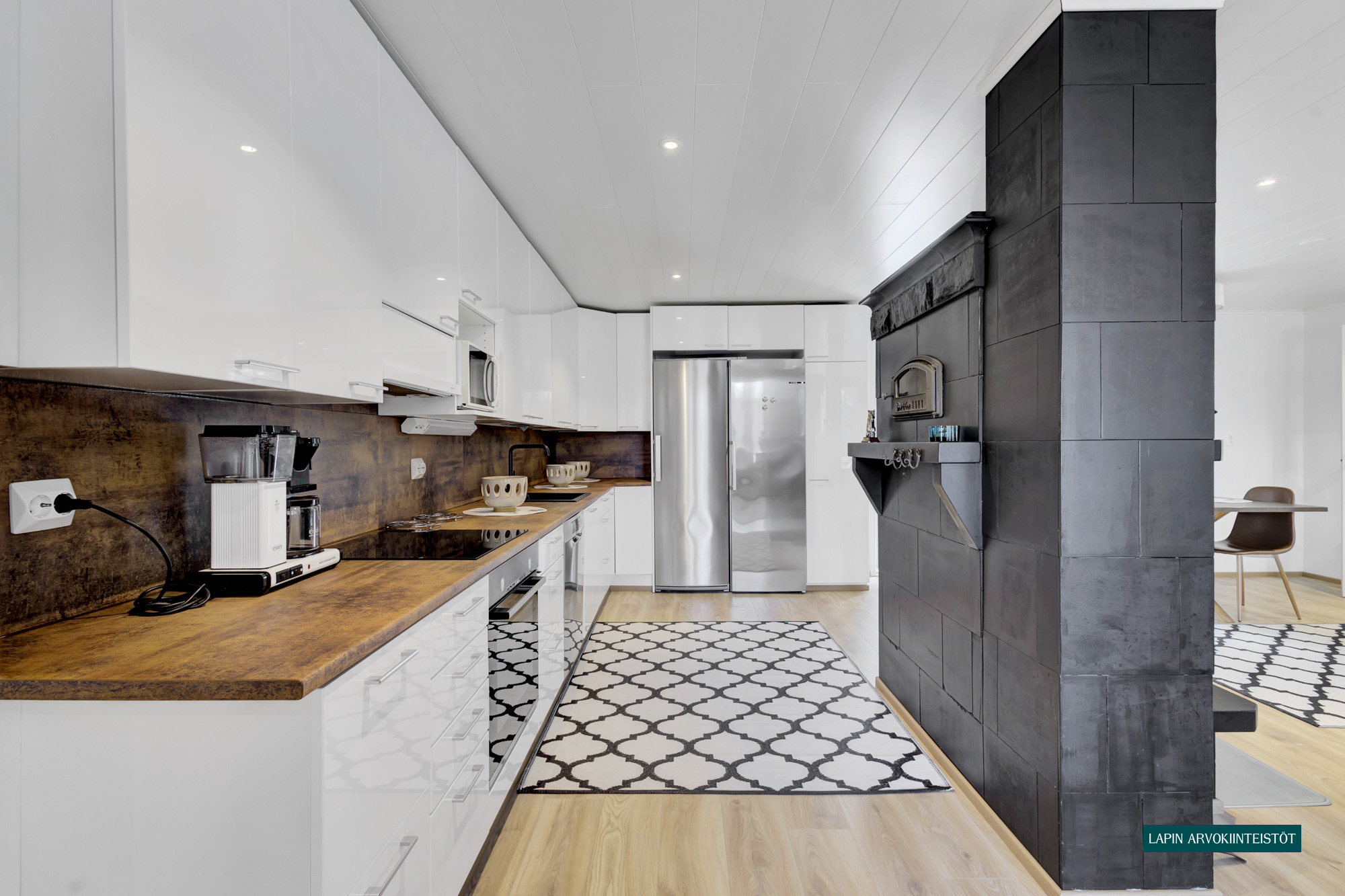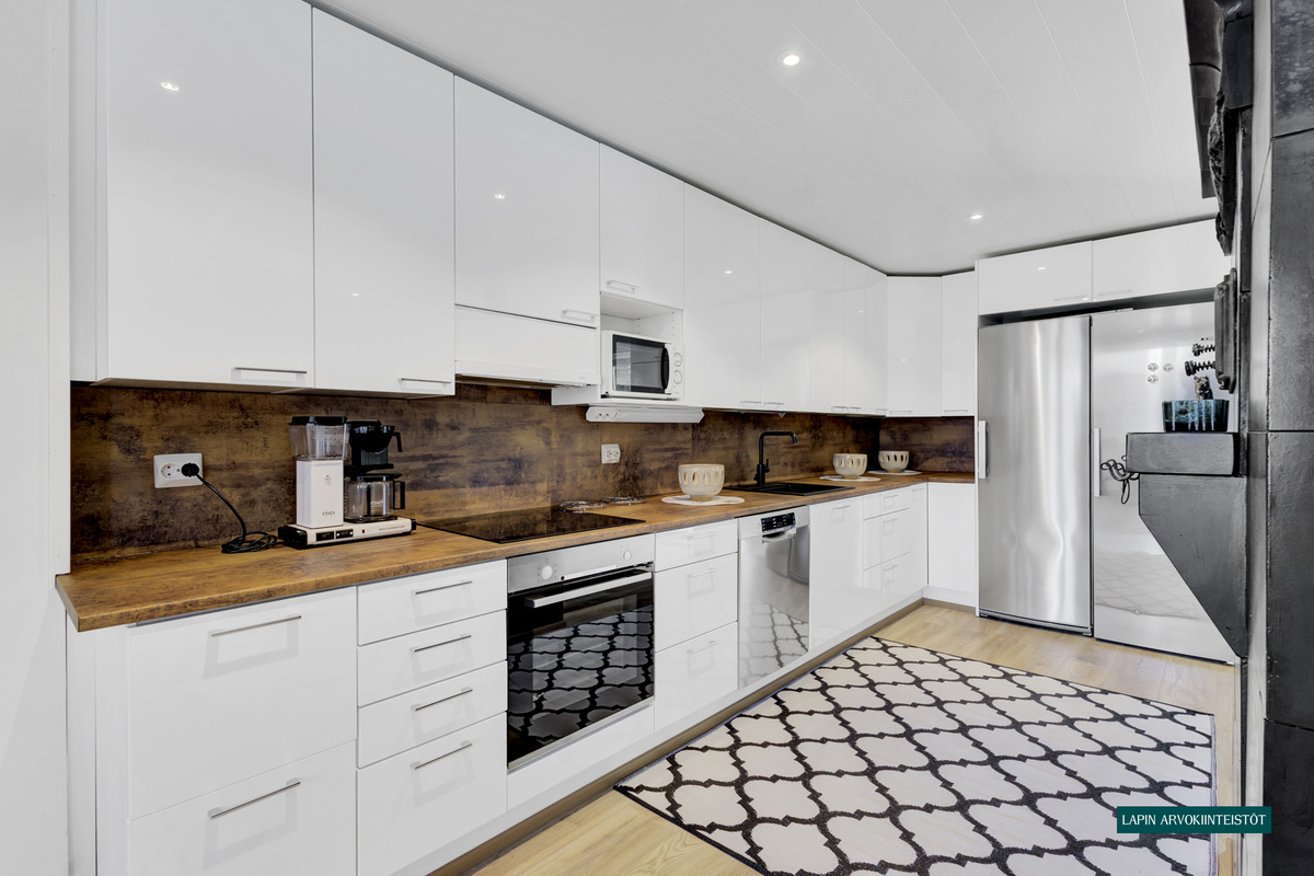 Varusteet: jääkaappi, pakastin, induktioliesi, erillisuuni, liesituuletin hormilla, leivinuuni, astianpesukone, kiinteät valaisimet