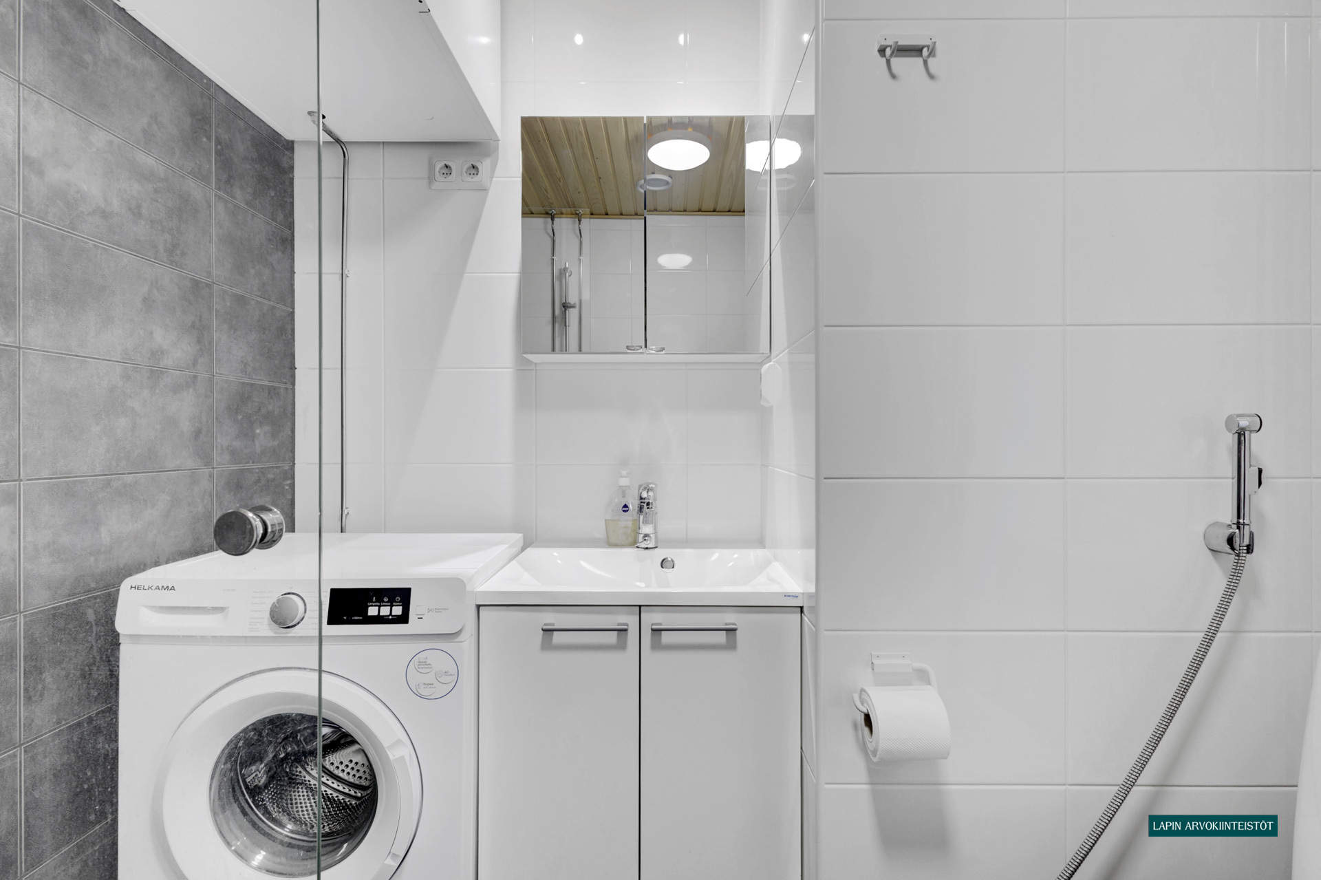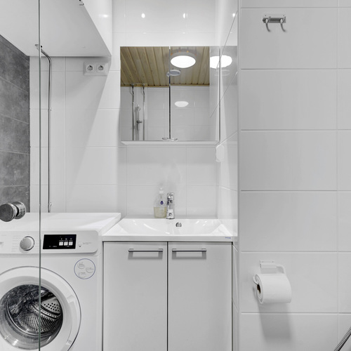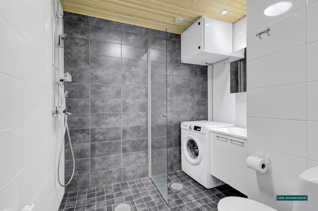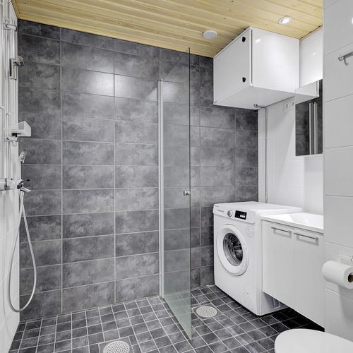 Varusteet: suihku, suihkuseinä, peilikaappi, allaskaappi, kiinteät valaisimet, pesukoneliitäntä, lattialämmitys