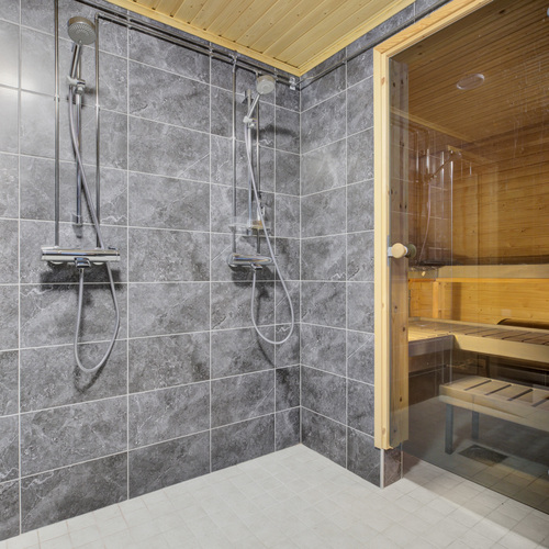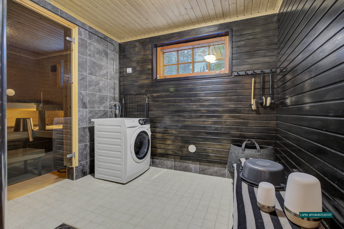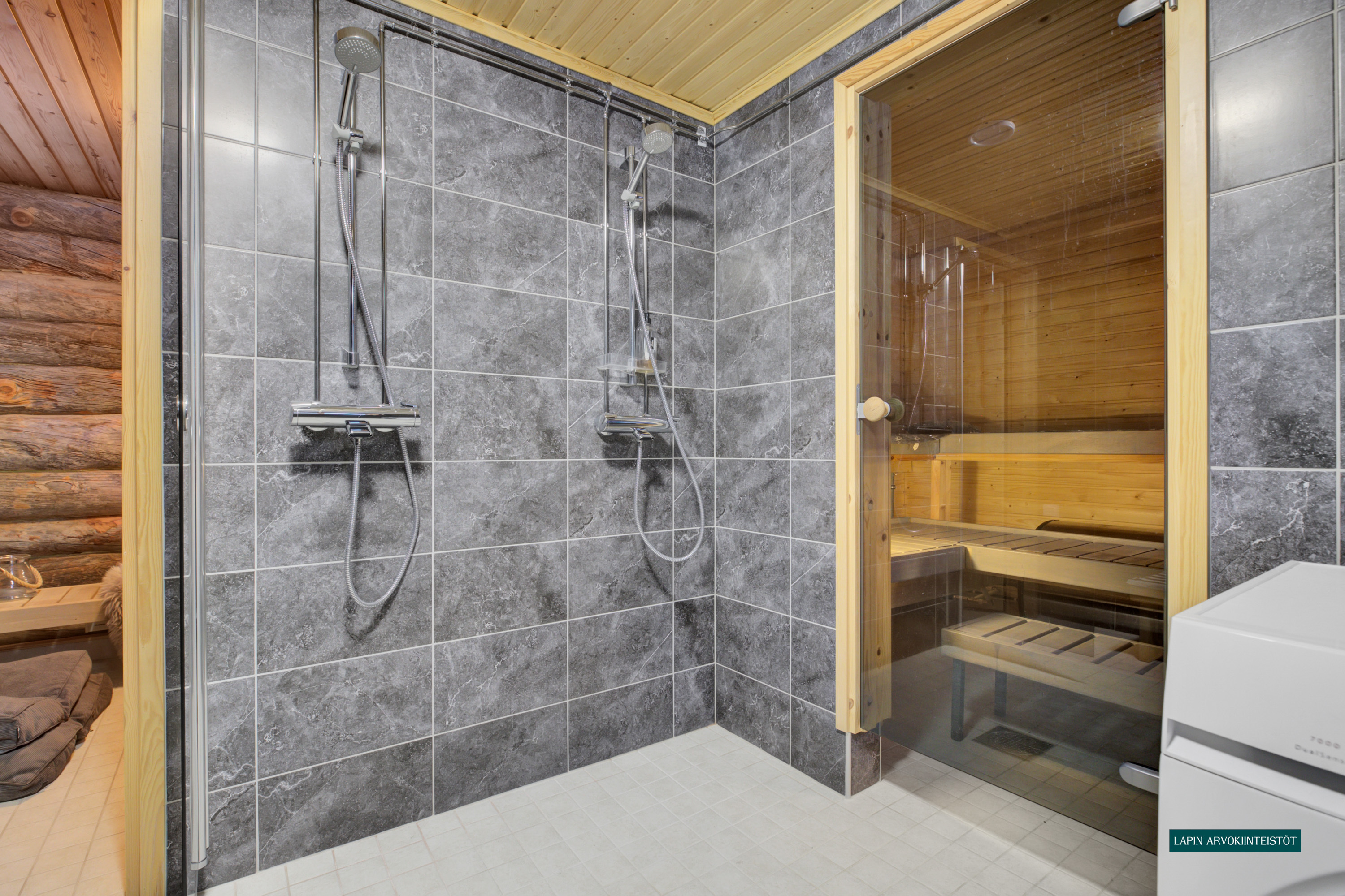 Varusteet: kaksi suihkua, suihkuseinä, lattialämmitys, kiinteät valaisimet, pesukoneliitäntä
