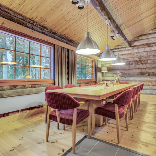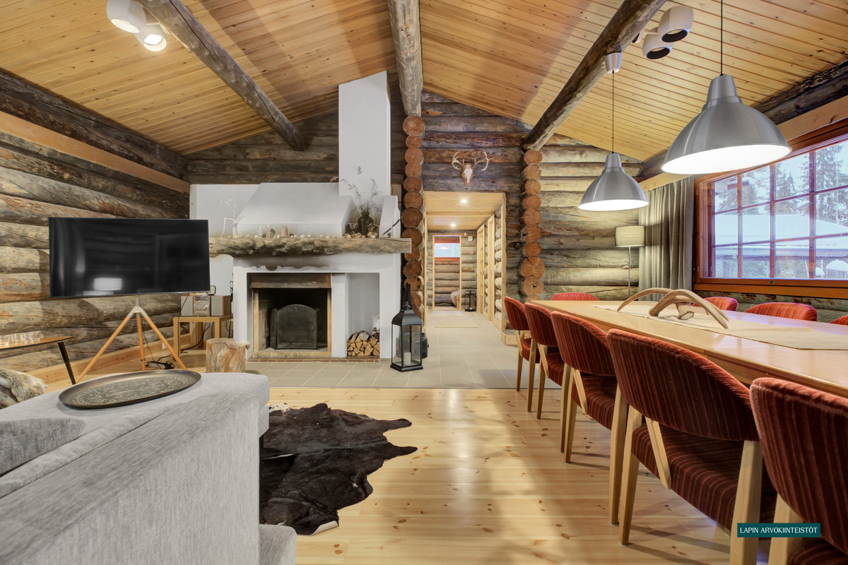Edustavassa olohuoneessa suuri takka ja ruokailutila 12 henkilölle.
