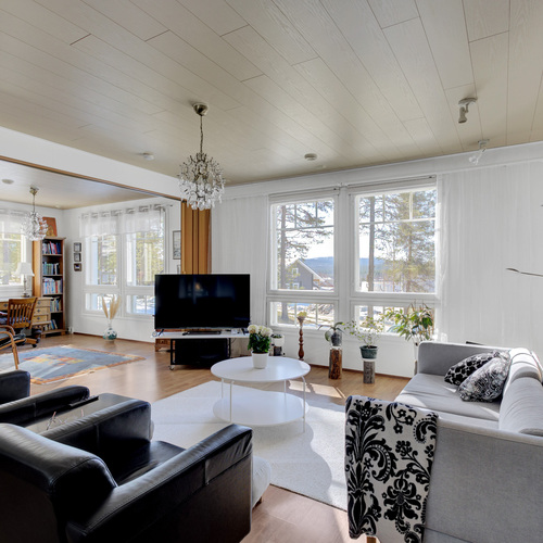 Olohuoneen ikkunoista näkymä Särkitunturille.