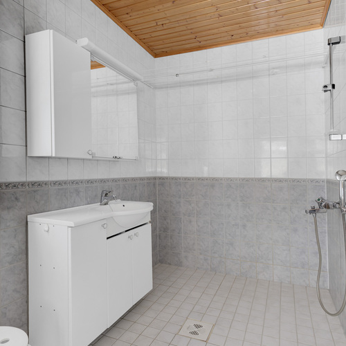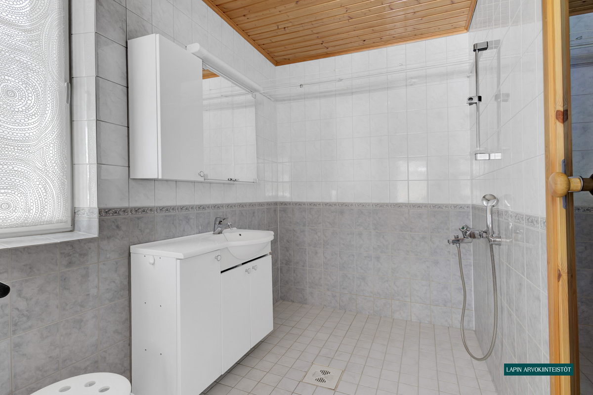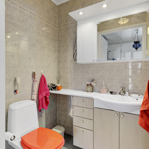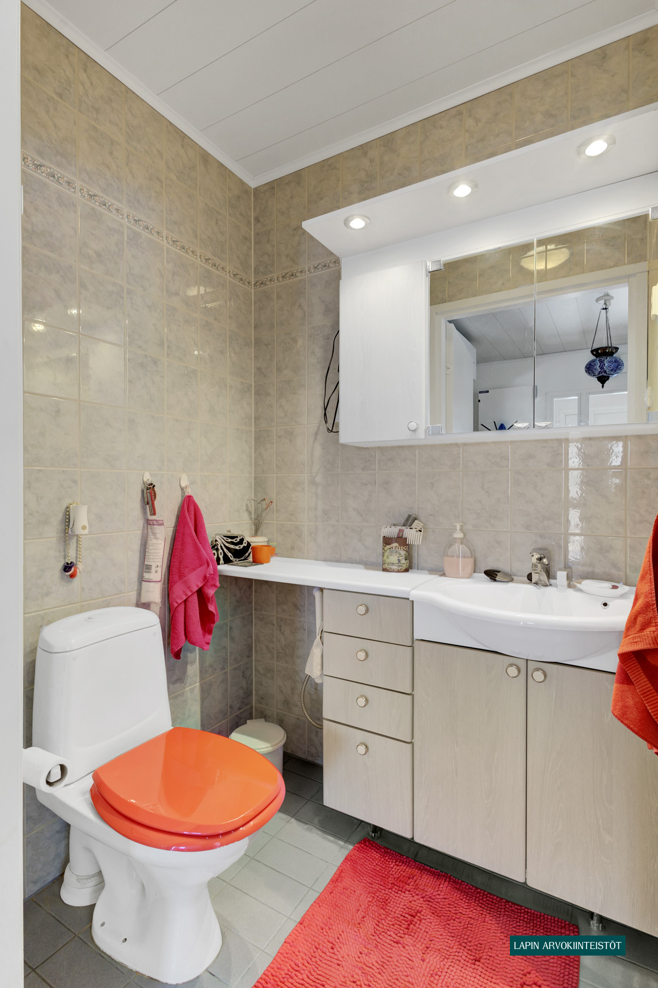 Varusteet: lattiaan asennettu WC, bidee, lattialämmitys, peilikaappi, allaskaappi