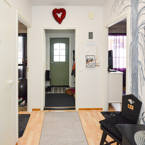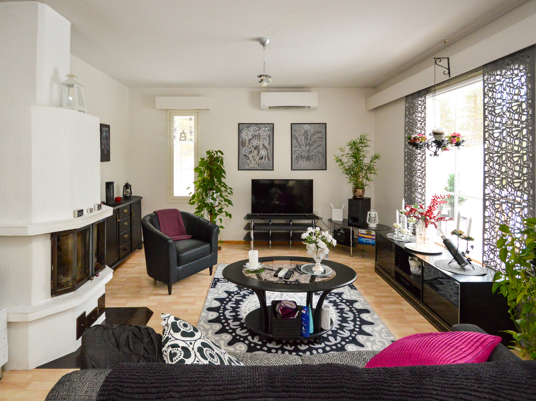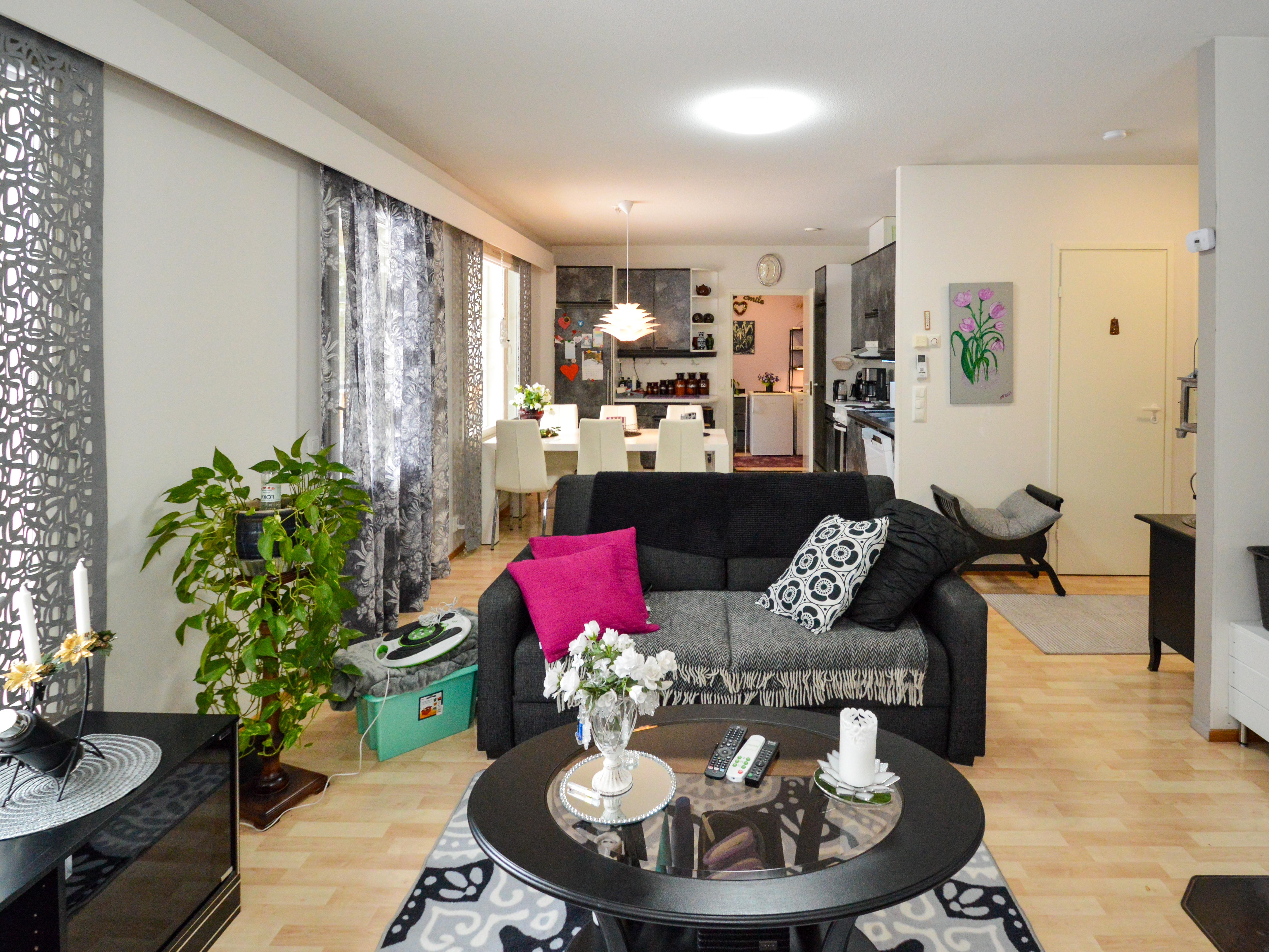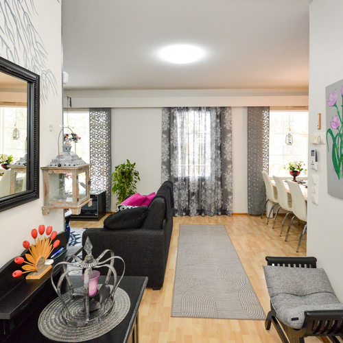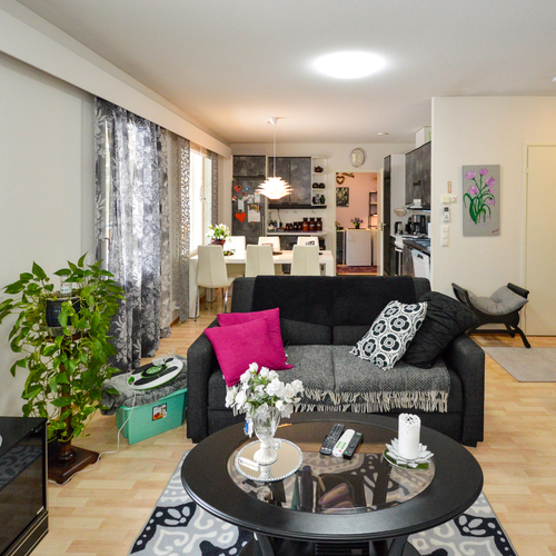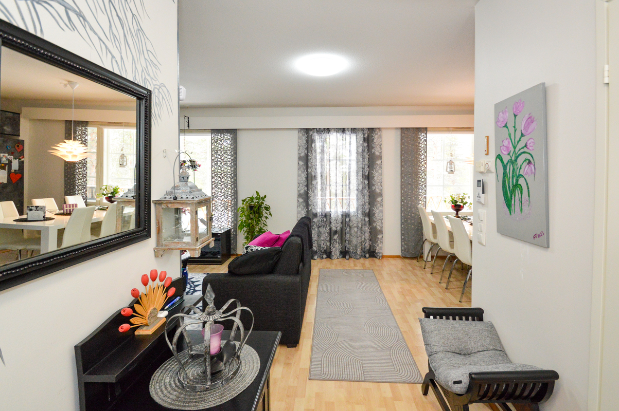 Huoneistossa on avokeittiö ja olohuone, jonka takka luo lämmintä tunnelmaa. Kesällä 2025 laajennettu 30-neliöinen terassi etelän suuntaan on tämän kodin kruunu, johon on suora käynti sekä olohuoneesta että kylpyhuoneen/kodinhoitohuoneen tiloista.