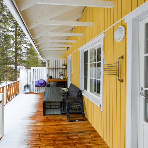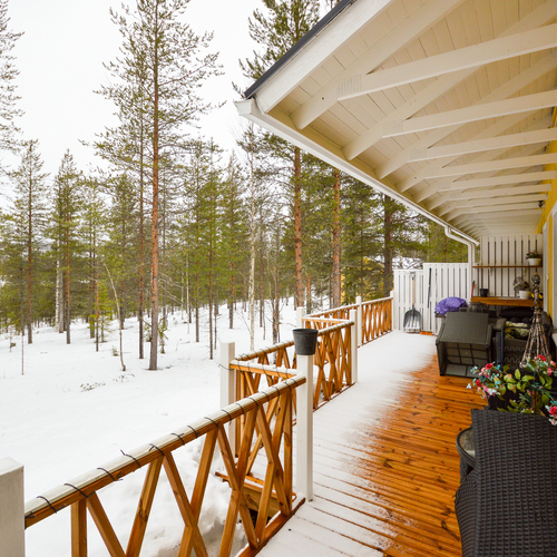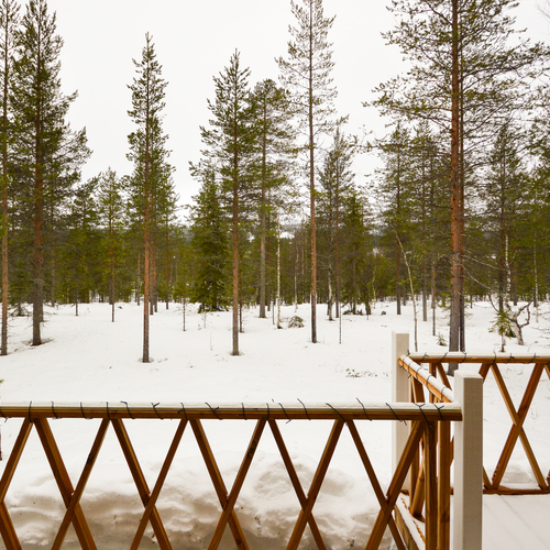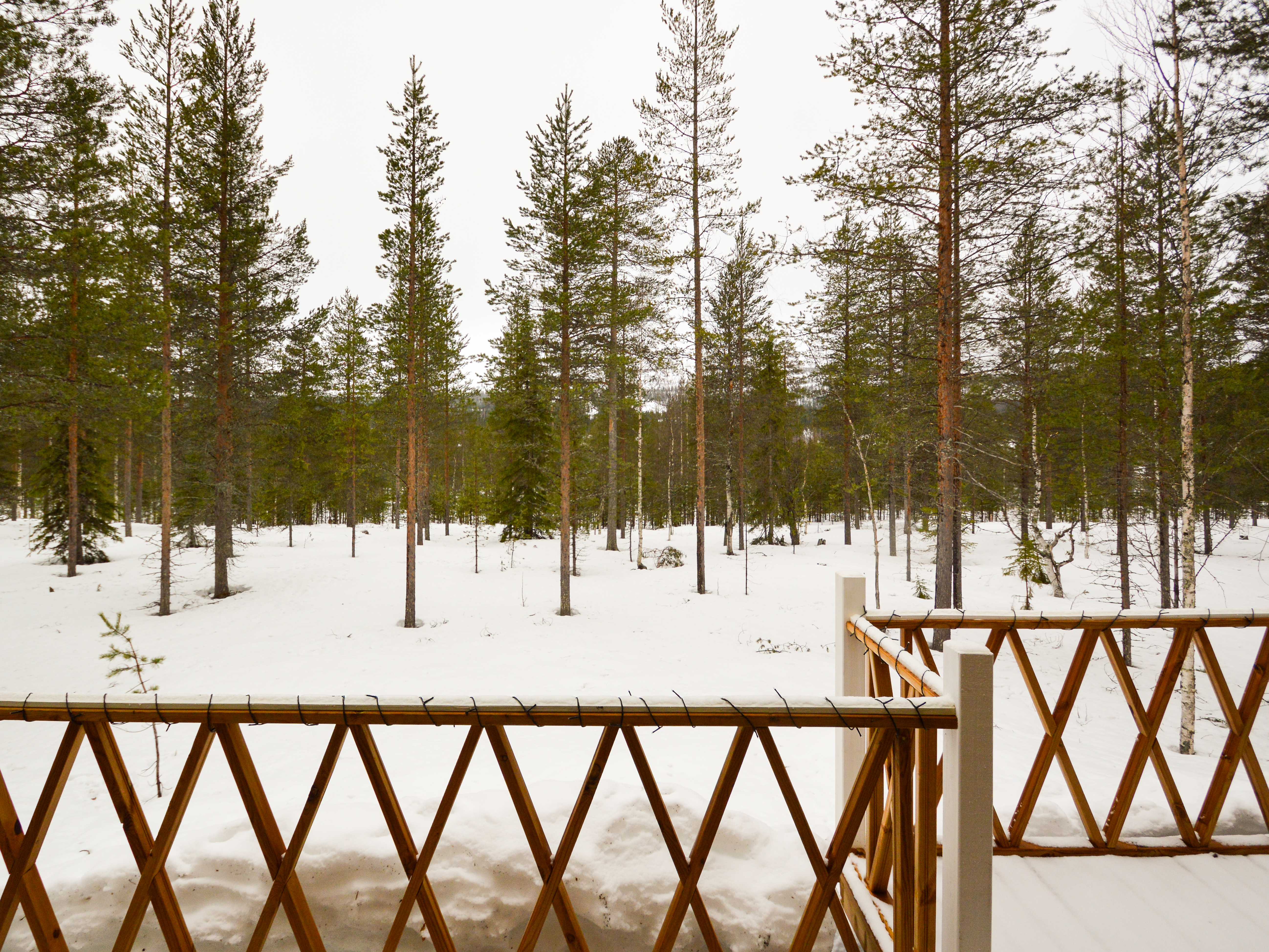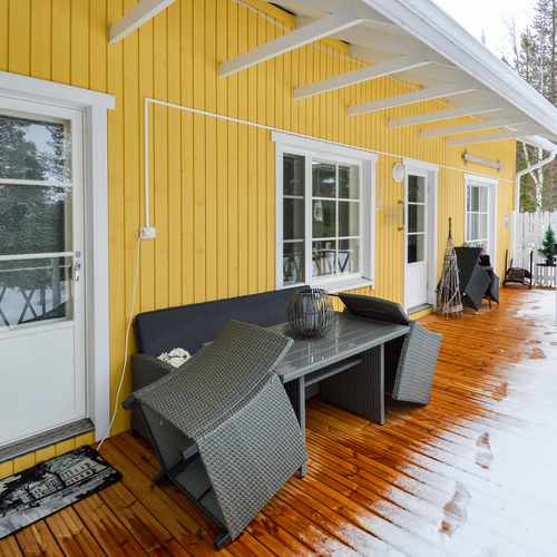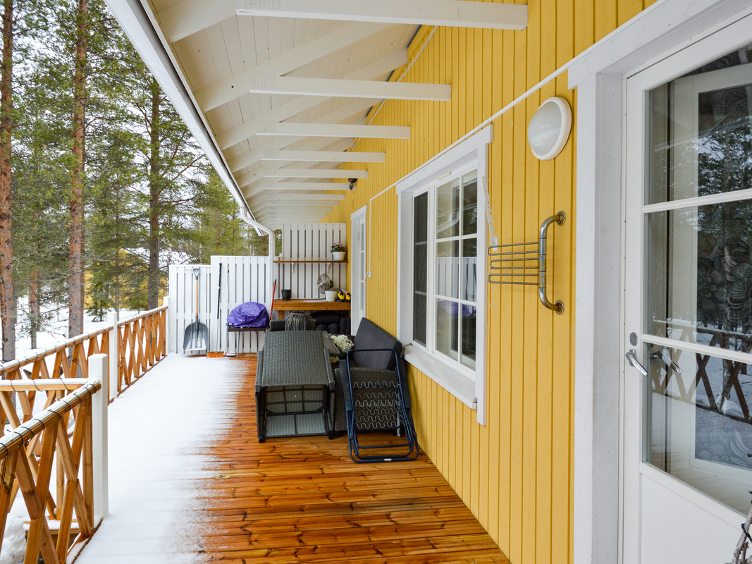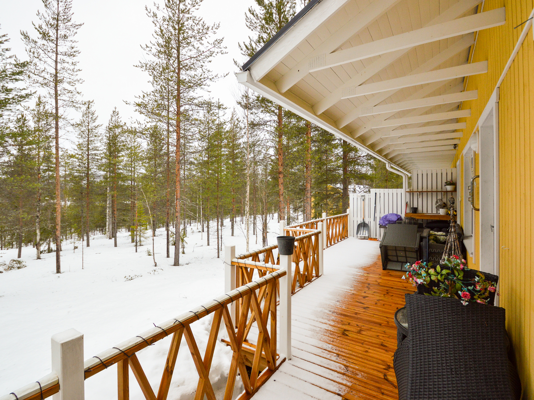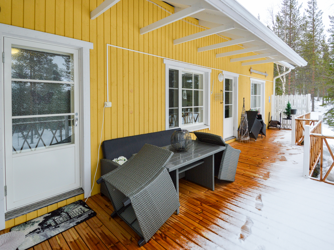 Huoneiston takapihalla iso terassi Luostotunturin suuntaan. Käynti terassille olohuoneesta ja kylpyhuone-/kodinhoitohuoneesta.