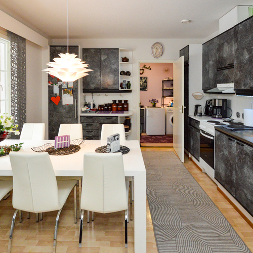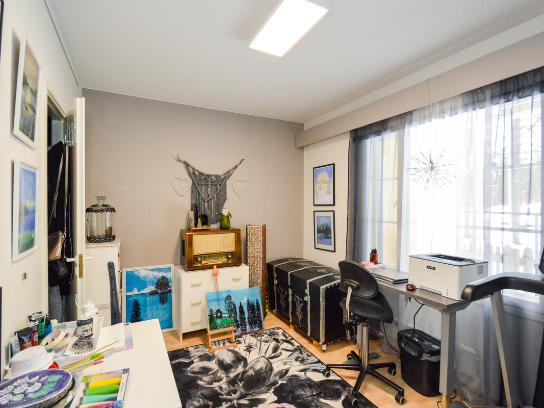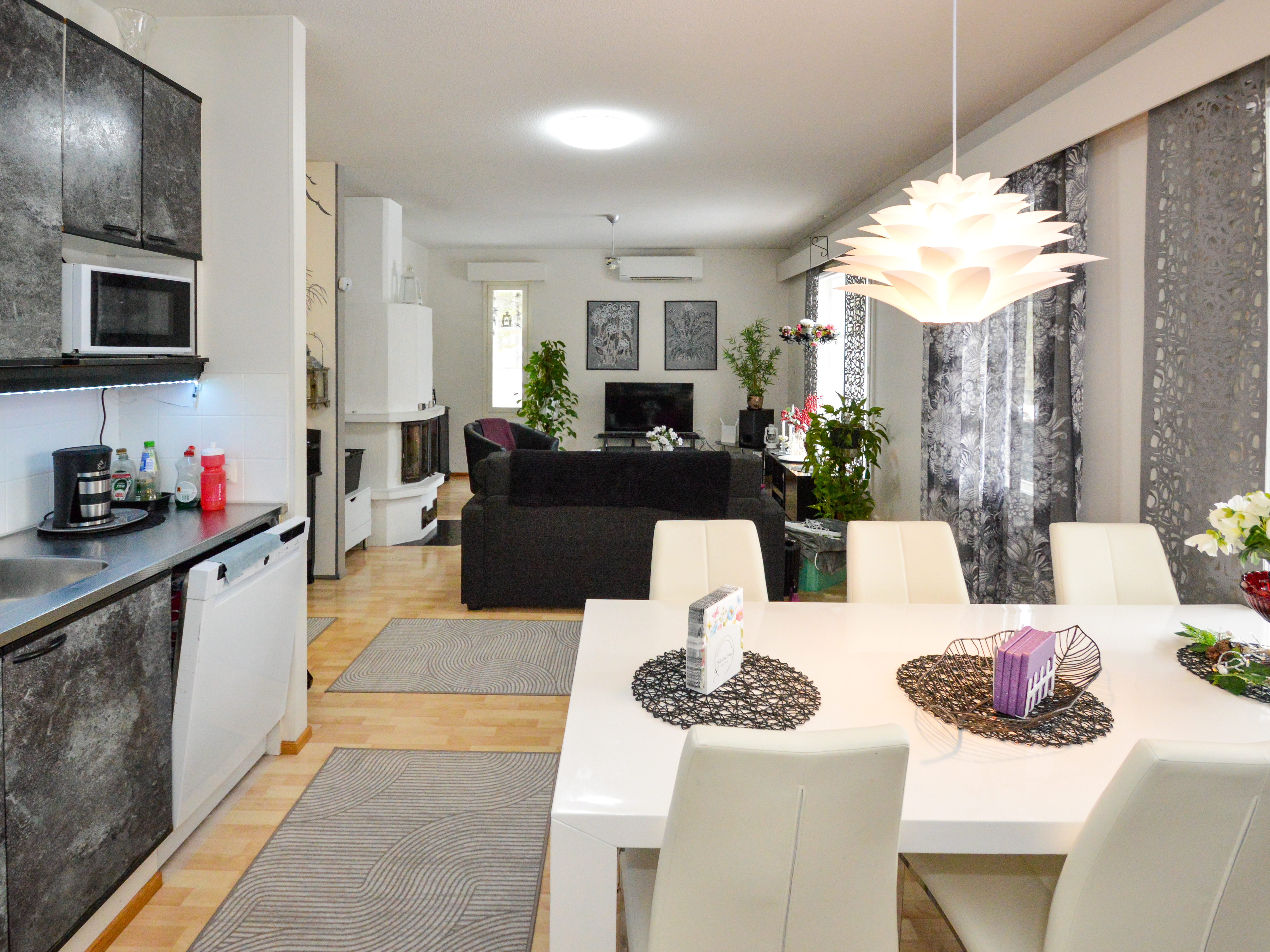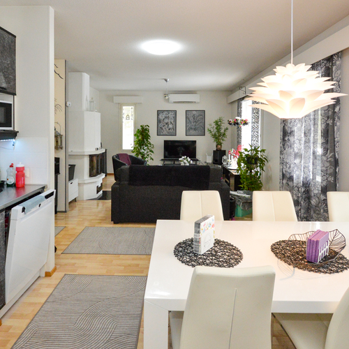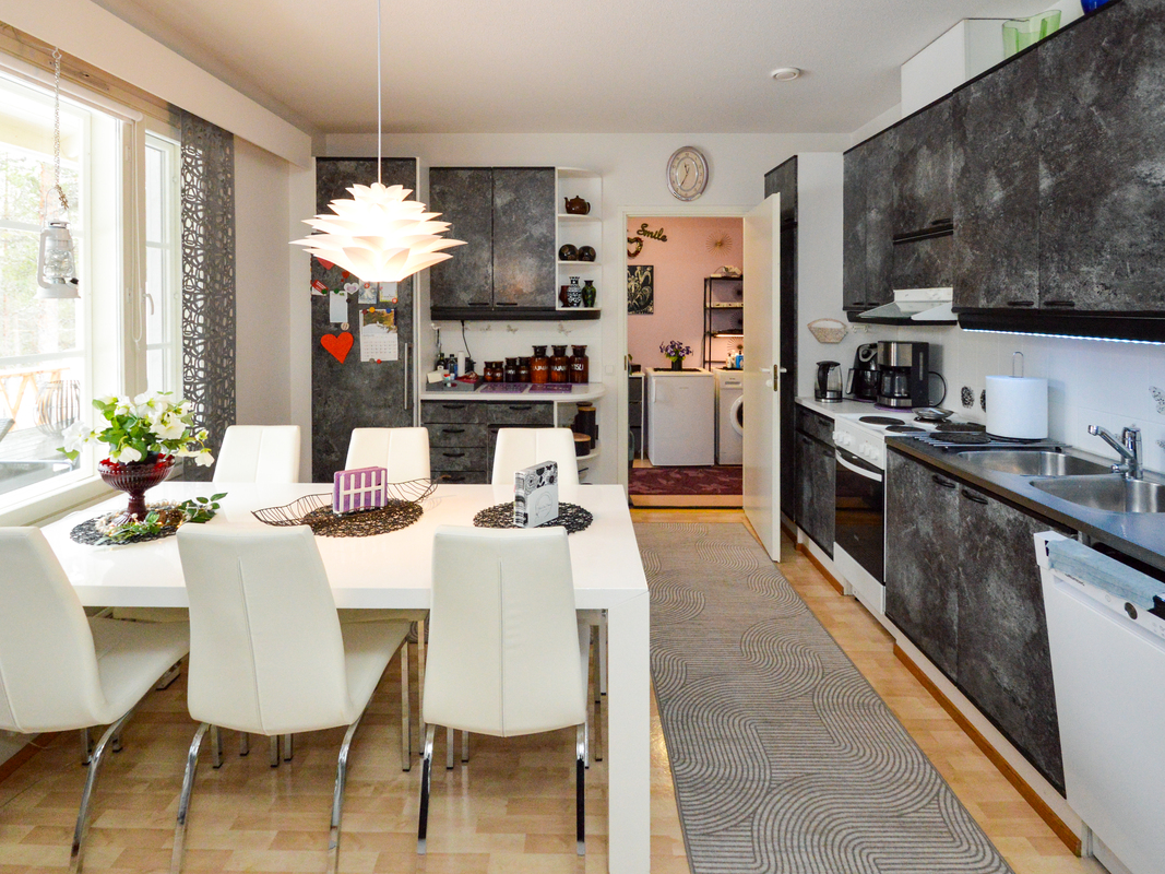 Asuminen on huoletonta sähköisen lattialämmityksen ja vuonna 2022 asennetun ilmalämpöpumpun ansiosta. Kauppaan sisältyy kattava varustus kalusteista pesukoneeseen, mikä tekee muutosta vaivatonta.
