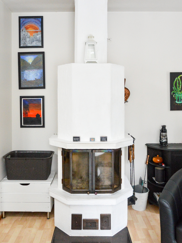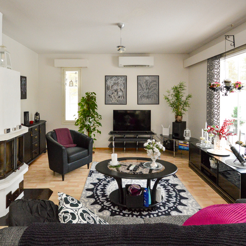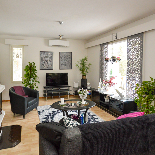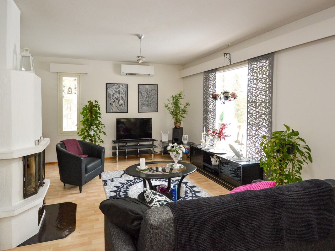 Olohuoneessa takka. Kalusteet ja tv sisältyvät kauppaan.