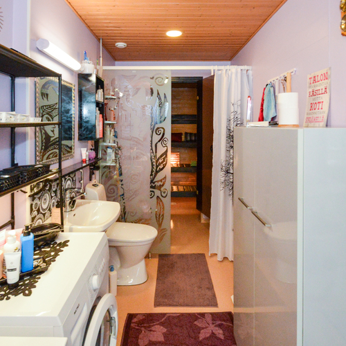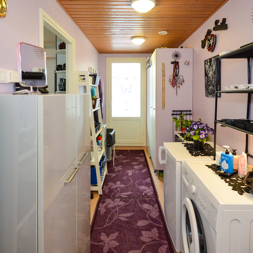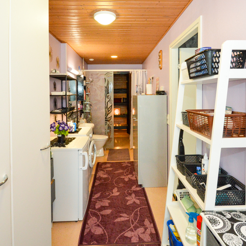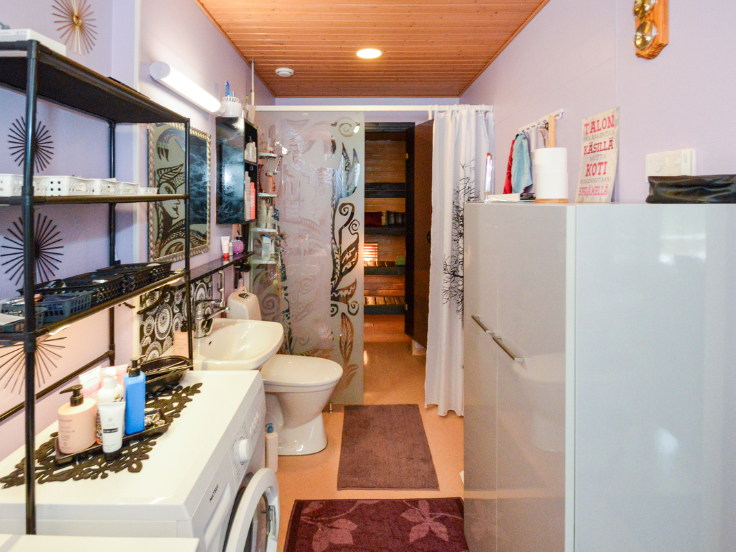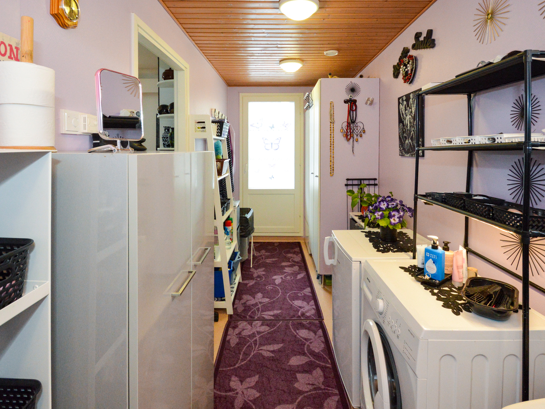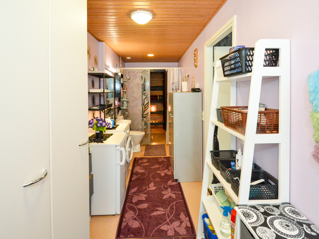 Iso kylpyhuone jossa lisäksi paljon kodinhoitotilaa. Kalusteet, mm. pesukone sisältyvät kauppaan. Tilasta käynti takapihan terassille.