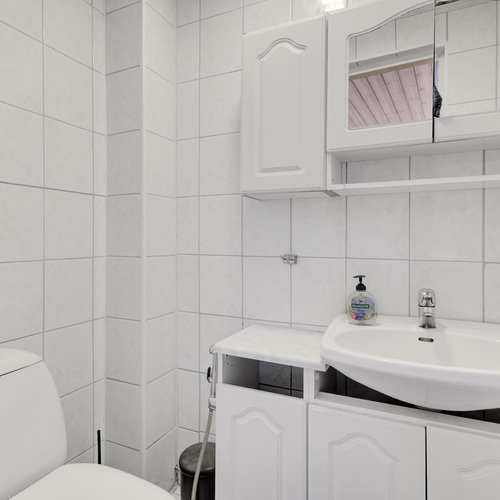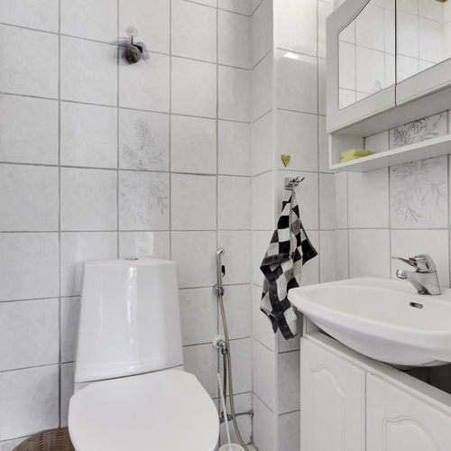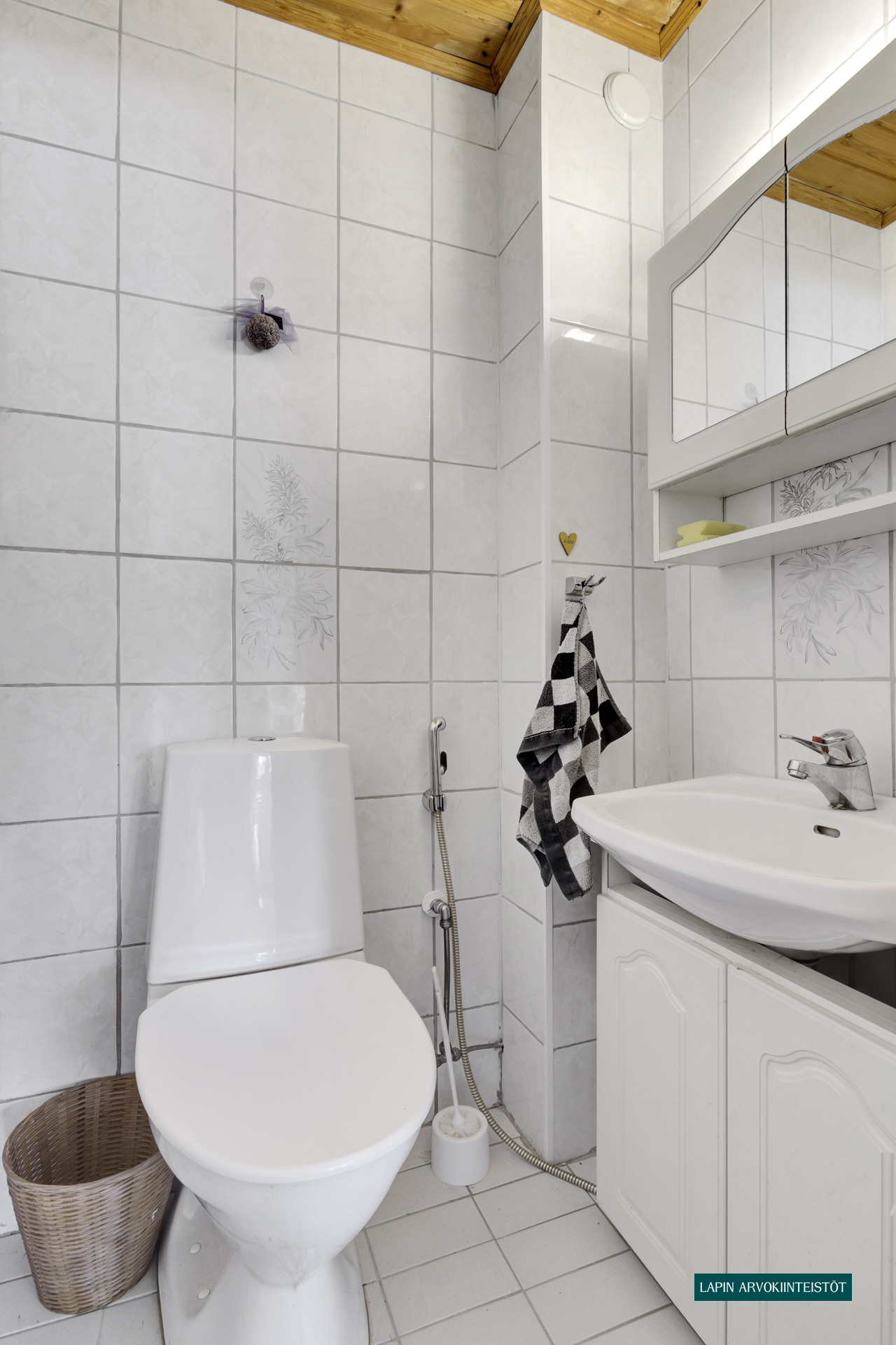 Varusteet: lattiaan asennettu WC, bidee, lattialämmitys, peilikaappi, allaskaappi
