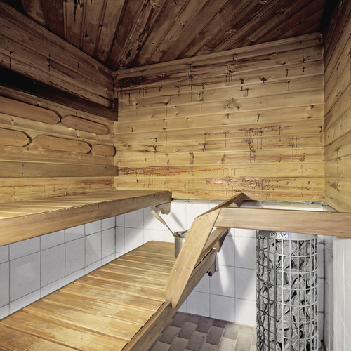 Alimmassa kerroksessa sijaitsevat saunaosasto pesuhuoneineen sekä oleskelutila.