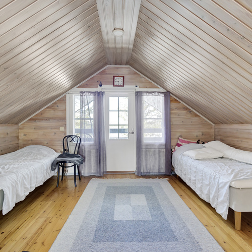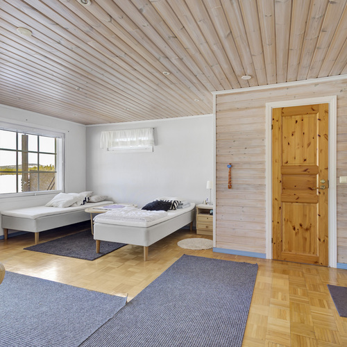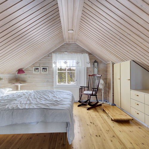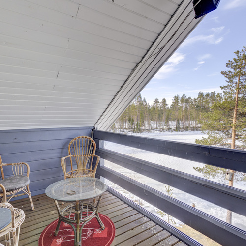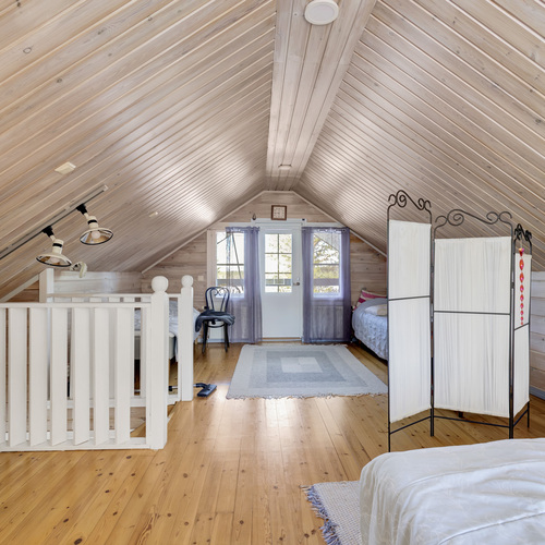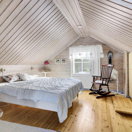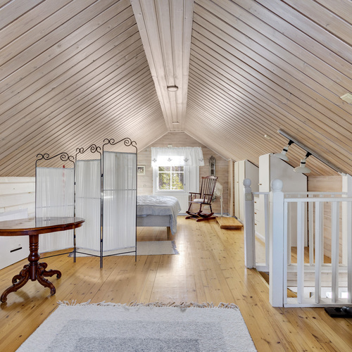 Ylimmässä kerroksessa sijaitsee makuutila parvekkeineen, josta avautuvat näkymät kruunaavat kodin tunnelman.